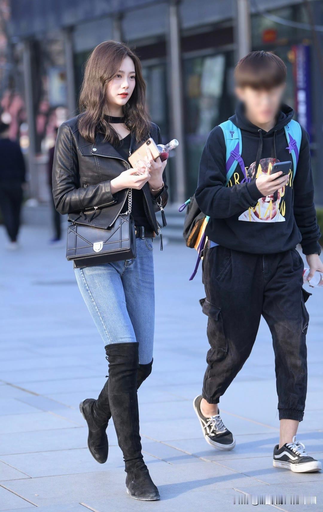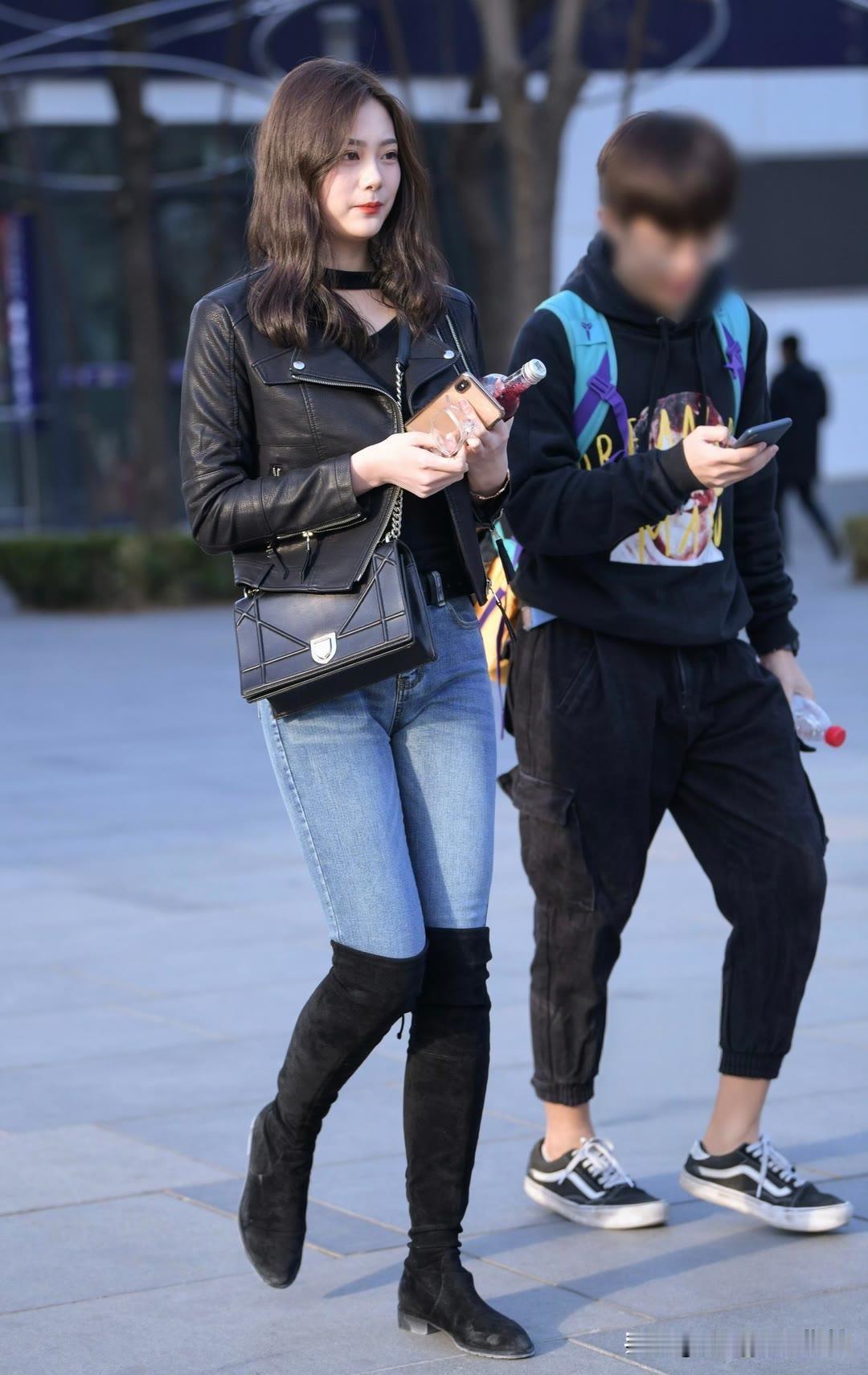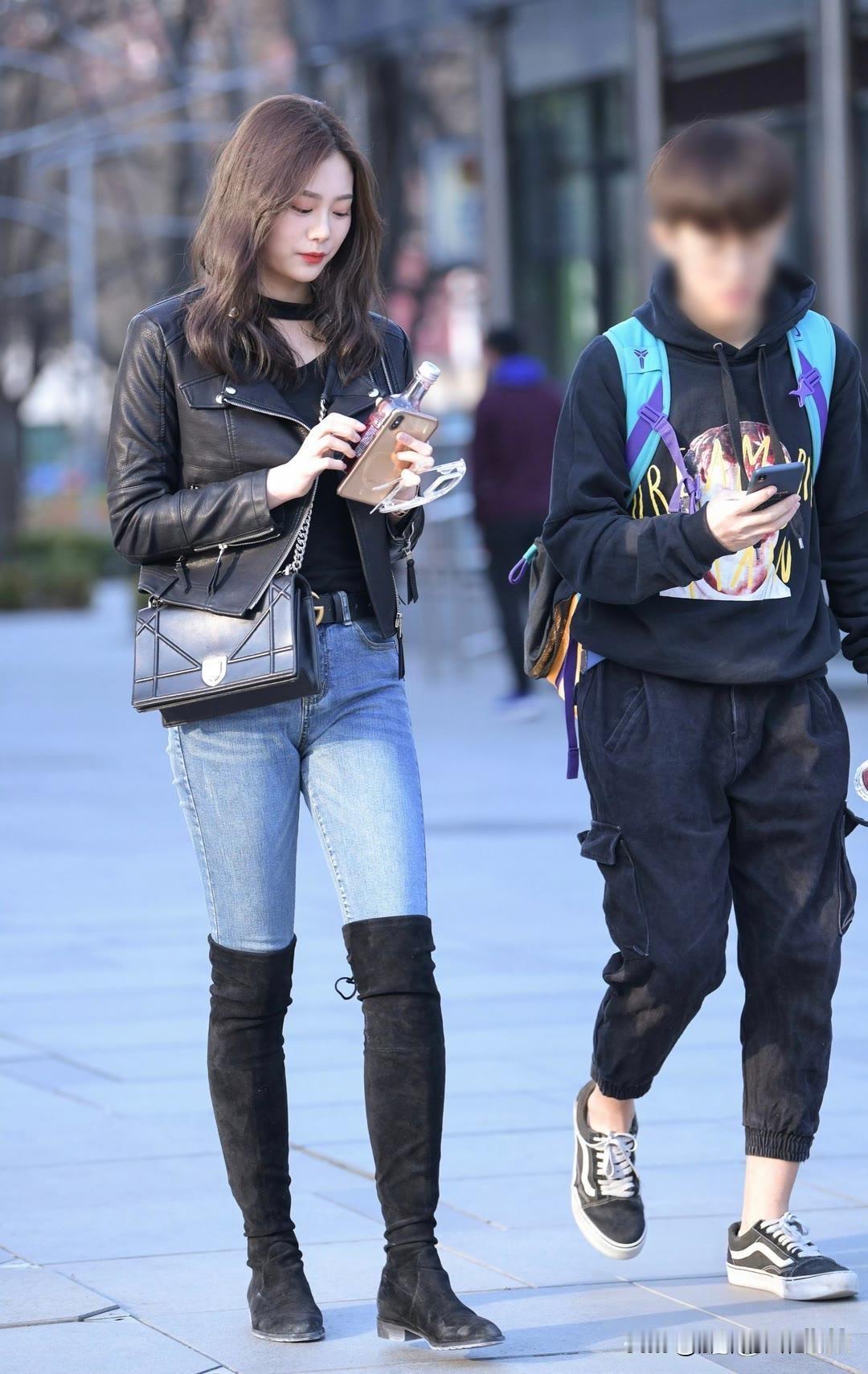 都市街头,酷炫皮夹克与牛仔裤的搭配永远不会过时。就像丁笑滢的这身酷飒穿搭,短款黑色皮夹克自带硬朗气场,上面的铆钉和立体剪裁,把机车感直接拉满。 内搭裸色高领紧身衣,完美勾勒出身材曲线,多了几分性感。低腰烟灰微喇牛仔裤更是一绝,丰胯加微喇的设计,不仅修饰腿型,还特别显腿长,复古感满满。 再配上带个性挂饰的黑色包包和尖头鞋,不管是街头出街,还是参加潮人聚会,都能轻松拿捏街头辣妹的感觉,简直又A又辣!
