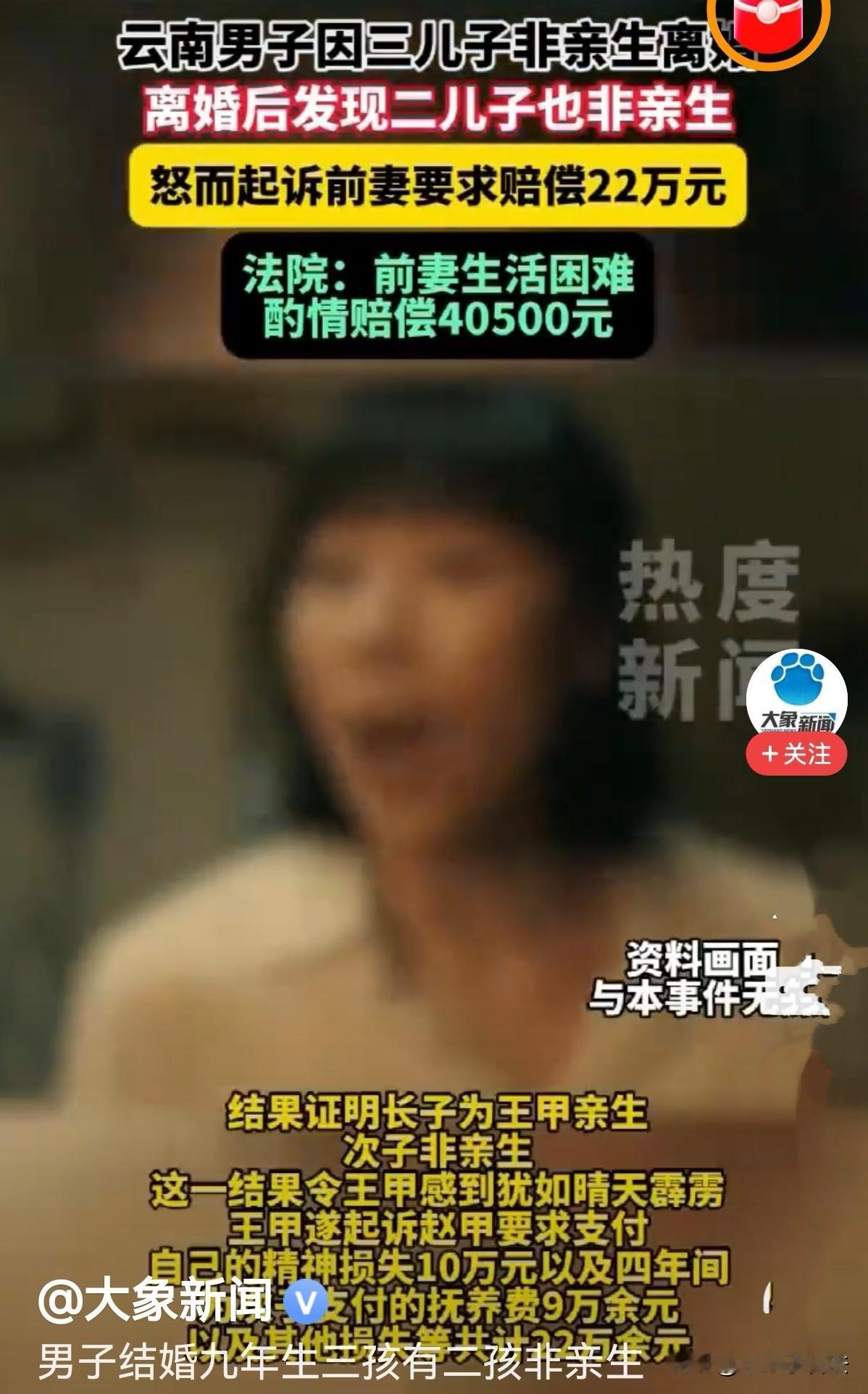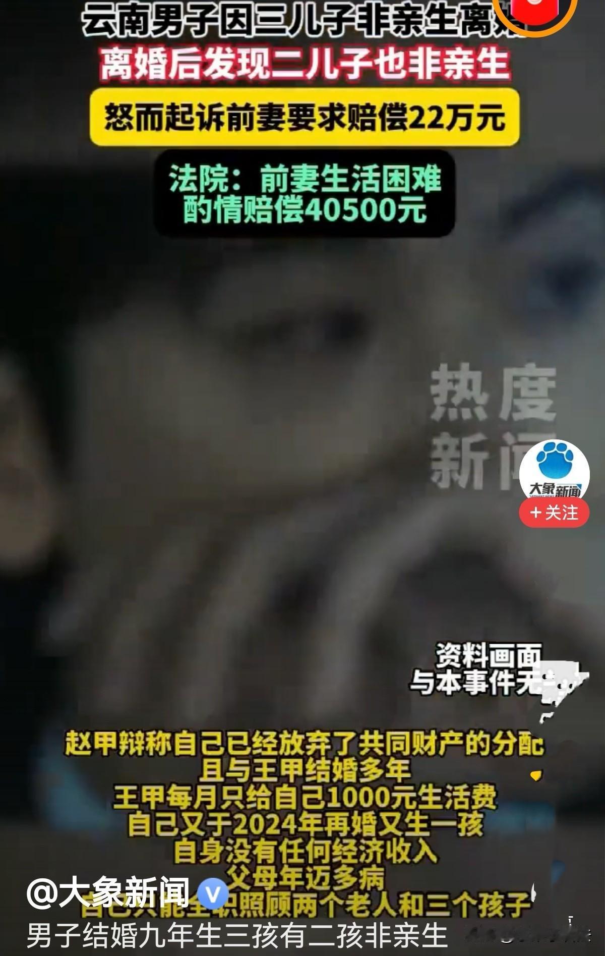 云南,男子与女子结婚9年,先后生下长子、次子,生活安稳幸福,然而女子怀上3胎后,男子掐指一算,觉得这个孩子非其骨肉,因此两人频繁发生争吵最后离婚。女子放弃夫妻共同财产独自抚养次子,男子独自抚养长子,双方互不支付抚养费。离婚3年后,越想越不对劲的男子带儿子去做亲子鉴定,竟发现3个子女2个毫无血缘关系。男子大为震怒,认为女子婚内背叛刻意隐瞒真相,索要次子抚养费与精神损害22万,法院判了! 2013年,王某与赵某携手走进婚姻的殿堂,一年后生下长子。 王某看着身边笑意盈盈的妻子,又望向蹒跚学步的长子,心里盘算着往后的日子好好挣钱,把孩子养大,守着这份平淡的幸福就够了。 2018年,次子降生,让这个家的热闹又添了几分。 王某觉得自己是天底下最幸运的男人,妻贤子旺,人生圆满不过如此。 有了两个儿子,王某生活压力更大了,可他看着孩子一天天长大,一点都不觉得累,只有满足。 日子像流水般淌过,转眼到了2022年。 当王某听到妻子怀上3胎的消息,心中升起一丝狐疑,他掐着日子算了又算,眉头越皱越紧。 那段时间,他因工作的缘故与妻子聚少离多,怎么会突然有孩子?这个念头像一根刺扎进了他的心里,拔不出来。 他忍不住质问赵某,可对方要么闪烁其词,要么就指责他胡思乱想、不信任她。 争吵成了家常便饭,曾经温馨的家变得家无宁日。 2022年7月,赵某去医院做引产,要求王某在风险承诺书上签字,可王某却未将签了字的承诺书送至医院,导致赵某引产未做成,3子出生。 2022年12月,两人协议离婚。妻子承认3子非其亲生,她信誓旦旦说长子、次子是其亲生,王某信以为真。 赵某自愿放弃全部夫妻共同财产,独自抚养次子,王某抚养长子,双方承诺互不支付抚养费。 王某心里五味杂陈,他以为妻子放弃夫妻共同财产,是对自己的补偿,也以为这场婚姻,就算是“干净”地了断了。 他想就算夫妻情分尽了,好歹还有两个儿子,往后各自安好,也就罢了。 时间一晃到了2025年8月,离婚已过3年,他看着渐渐长大的两个儿子,一个眉眼酷似自己,一个却总觉得有些陌生,突然他有了想做亲子鉴定的冲动! 当他看到鉴定报告的那一刻,大脑一片空白,差点没晕过去!原来鉴定结果为:长子确为亲生,次子与他无血缘关系。 想起2022年导致他们婚姻破裂的第3个孩子,同样与他没有任何血缘关系,他崩溃了! 原来,婚后9年生的3个孩子2个非亲生!原来,他在婚姻里付出的那些真心、那些精力、那些金钱,都成了一场笑话。原来,离婚时的那份“补偿”,不过是妻子掩盖谎言的遮羞布。 赵某从一开始,就刻意隐瞒了次子非亲生的事实,让他在全然不知情的情况下,签下了那份看似公平的离婚协议。 王某只觉得浑身冰冷,像是掉进了冰窟,愤怒和委屈像潮水般将他淹没。 2025年11月,王某一纸诉状将赵某告上法庭。要求前妻支付被欺骗造成精神损失费10万元及了、次子4年的抚养费9万元、及其他费用共22万元。 根据《民法典》第1043条规定,赵某在婚姻存续期间出轨并孕育非婚生子女,且刻意隐瞒次子非亲生的事实,违背了夫妻忠实义务。 《民法典》第1183条规定:侵害自然人人身权益造成严重精神损害的,被侵权人有权请求精神损害赔偿。 因故意或者重大过失侵害自然人具有人身意义的特定物造成严重精神损害的,被侵权人有权请求精神损害赔偿。 王某对次子投入了深厚的父爱,在长达数年的时间里,一直误以为对方是自己的亲生儿子。 赵某的隐瞒行为,直接导致王某的情感受到巨大冲击,属于“侵害自然人人身权益造成严重精神损害”的情形。因此,王某有权依据该条款主张精神损害抚慰金。 《民法典》第985条规定:得利人没有法律根据取得不当利益的,受损失的人可以请求得利人返还取得的利益,但是有下列情形之一的除外:(一)为履行道德义务进行的给付;(二)债务到期之前的清偿;(三)明知无给付义务而进行的债务清偿。 赵某是次子的生母,负有法定的抚养义务。而王某因受欺骗,误以为自己是次子的生父,才支付了相应的抚养费,其给付行为并无法律根据。 赵某因此减少了自身应承担的抚养开支,属于不当得利。因此,王某有权要求赵某返还已支付的抚养费。 赵某辩称自己于2024年已再婚并又生一子,她要负担年迈多病父母和3个孩子,并无收入,经济负担较重。 并且与王某结婚多年,他每月只给自己1000元生活费,与他离婚时已主动放弃夫妻共同财产的分配权。 法院综合考量赵某的过错程度、当地的经济发展水平、她的实际负担能力,以及离婚时已放弃全部夫妻共同财产的实际情况。 法院最终判决:赵某赔偿王某精神损害抚慰金1.5万元;按每月500元计算,赵某返还王某为抚养次子支出的抚养费2.55万元,总计4.05万元。 对此您怎么看?