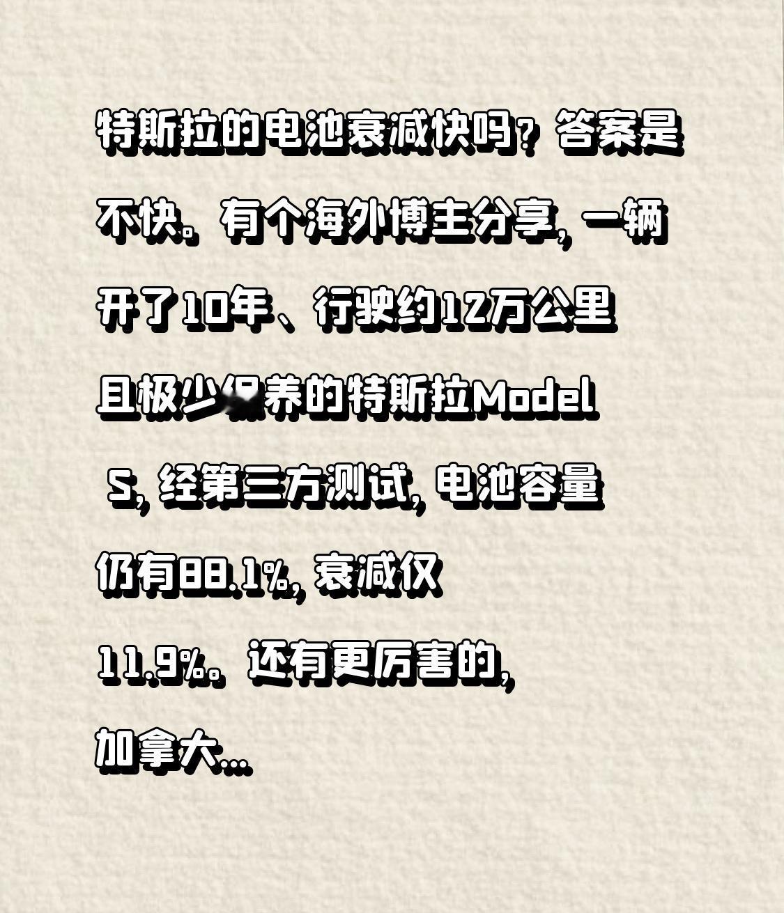 特斯拉的电池衰减快吗? 答案是不快。有个海外博主分享,一辆开了10年、行驶约12万公里且极少保养的特斯拉Model S,经第三方测试,电池容量仍有88.1%,衰减仅11.9%。 还有更厉害的,加拿大一位Model S车主行驶160万公里,电池才衰减12%。按照特斯拉报告,Model S/X行驶32万公里后,平均容量保持率达88%。 全自动电池管理系统;另一方面,三元锂电池的衰减规律也很友好,前4万公里衰减约5%,之后每4万公里衰减约1%。再加上车主浅充浅放、常用慢充等好习惯,特斯拉电池的表现远超预期。