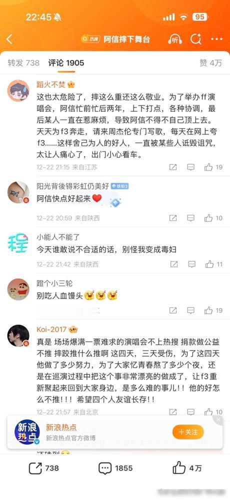 突发,湾湾天王阿信在F3的上海站演唱会上摔下舞台。重摔下手部流🩸,吴建豪吓得飞奔到阿信摔下的区域,试图救助。 这场上海演唱会本来是不少人的青春圆梦现场,结果阿信在台上踩空出了意外,整个人重重摔了下去。现场照片里他手上的血迹还没干,但他稍微处理了一下就立马爬回台上继续唱,这份定力确实让人心惊。 我更在意的是,大家都看他在台上嗓音嘹亮,却总忘了这哥们儿其实都50岁了。这个年纪重重摔一下真不是闹着玩的,身体恢复力不比年轻人,但他那种骨子里的使命感,好像瞬间就压过了身体的疼痛。 说个细节,这次F3重聚其实背后全是他在苦撑。为了这场演出,他前后忙活了整整两年,从各种打点协调到请周杰伦专门写歌,甚至很多麻烦事最后都是他自己顶上去解决。对他来说,这不只是一场秀,更是他这两年全部的心血。 当时周渝民在台上紧紧搂着他,吴建豪更是心疼地直接亲了他的脸颊。这种兄弟间的反应是骗不了人的,估计同伴们也是被他那种“死磕到底”的精神给震撼到了,谁都不希望这两年的努力因为意外而白费。 其实阿信后面排了整整13场演唱会,工作强度大得惊人。虽然大家都在夸他敬业、热爱舞台,但看着他带着还没止住血的手继续坚持,那种“不能让大家努力白费”的责任感,确实挺让人泪目的。 说句实在话,今年的舞台安全真的该引起重视了,从之前的刘德华到现在的阿信,险情出得实在太频繁。这种“带伤坚持”的剧本虽然感人,但作为粉丝,我们更希望看到艺人能在百分之百安全的环境下发光发热。