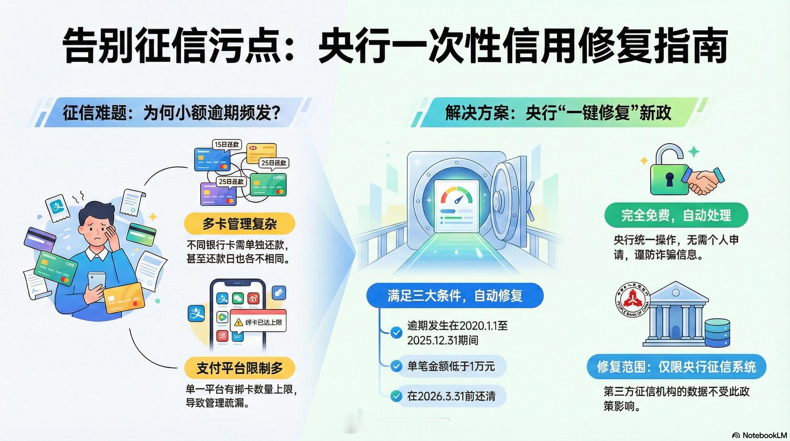 🔥征信一次性“自动洗白”,玩卡人的时代真的变了今天上午,各大玩卡群直接炸锅。原因很简单——中国人民银行官方平台发布了👉《中国人民银行关于实施一次性信用修复政策有关安排的通知(政策问答)》我认真把全文研究了一遍,只能说一句话:这不是小修小补,这是直接改规则。甚至可以说,26 年之后的申卡格局,可能被它彻底重塑。✅ 一句话说清楚新政策(重点必看)只要你满足这 4 个条件:📅 逾期发生时间:2020 年 1 月 1 日 ~ 2025 年 12 月 31 日💰 单笔逾期金额 ≤ 10000 元💸 在 2026 年 3 月 31 日前已足额还清🏦 属于央行征信系统记录那么👇对应的逾期记录,将由央行统一、自动清除。不收费、不申请、不人工、不操作。6 年内,不管逾期过多少次,只看“单笔金额”。说一句不过分的:👉 免费、官方、自动洗白。💥为什么这是「玩卡党的核弹级利好」?说句大实话:最容易出现“≤1 万小额逾期”的,就是我们这群人。① 全家桶 = 还款地狱广发、兴业这种👉 信报不合并一人 6–10 张卡每张卡单独账单、单独还款日你只要漏一张,就可能中招。② 卡一多,管理成本指数级上升微信 / 支付宝 / 云闪付👉 绑卡数量有限运通、单标外币卡👉 云闪付支持不完整查不到账单 / 还不了款👉 纯靠记忆 = 必翻车而这种逾期——✔ 金额小✔ 非恶意✔ 最多几百、几千正好命中这次政策的“保护区间”。🚧 一个时代的门槛,真的倒了过去我们最怕什么?❌「近 1/3/5 年不能有连 2 累 6」❌「历史逾期直接一票否决」现在?👉 只要还清,直接抹平。等征信恢复后——之前被拒的卡下不来的额度被“黑历史”卡死的通道都可以重新再试。黄金大涨原因支持个人信用重塑一次性信用修复个人无需申请 深圳·华润前海中心