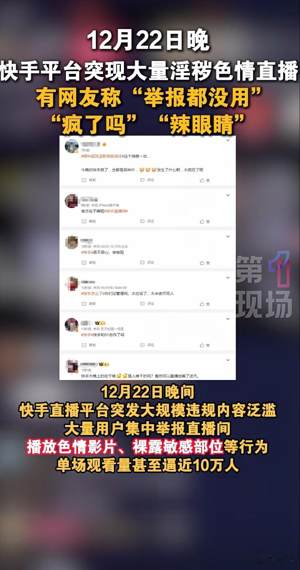 劲爆消息! 昨晚快手直播间出现大量不雅内容! 据昨晚,网友发现快手直播间出现大量色情内容,并且说举报都没用。 到今天凌晨快手页面已清空,并回应称遭受黑灰产业攻击,已上报相关部门,并报警处理。 看到这,国家是应该要好好整顿了,还给大家一个干净和积极向上的网络环境。 再说,平台也要监管到位,遇到这样的不雅视频应该立即关停。 最后提醒大家,直播间链接不要点进去,不要相信,会被盗号,包括你的微信号也会被盗,年底了,各位注意防范,陌生链接都不要点!不然你的钱怎么不见的,都不知道。 网络直播乱象 低俗网红直播 快手站 快手乱象 快手