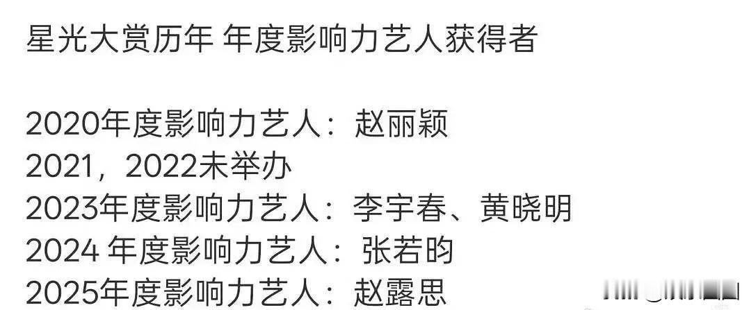 星光大赏历年年度影响力艺人获得者如下: 2020年度影响力艺人:赵丽颖 2021、2022年:未举办 2023年度影响力艺人:李宇春、黄晓明 2024年度影响力艺人:张若昀 2025年度影响力艺人:赵露思