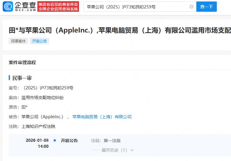 【苹果公司滥用市场支配地位被罚约9860万欧元,曾多次被起诉】 据报道,意大利竞争与市场管理局22日发布公告,宣布对美国苹果公司处以约9860万欧元罚款,原因是该公司滥用市场支配地位。 企查查APP显示,苹果公司曾涉多起滥用市场支配地位纠纷。其中,田某与苹果公司(AppleInc.)、苹果电脑贸易(上海)有限公司滥用市场支配地位纠纷一案,计划将于2026年1月8日开庭审理。