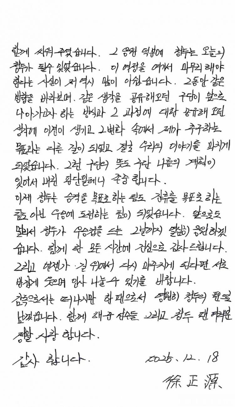博主“Mahone_13”更新社媒,晒出了徐正源于12月18日手写给成都蓉城的告别信,落款处则是用汉字写上了自己的名字。