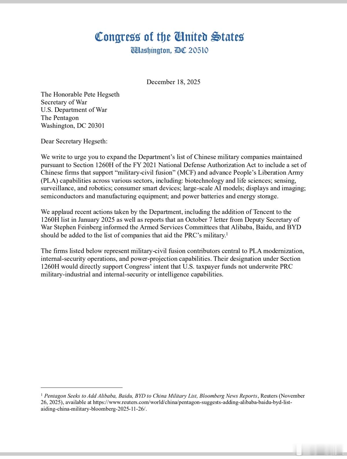 【美国国防部的“1260H”名单】12 月 18 日(当地时间),特朗普签署了《2026 财年国防 预算授权法》(NDAA 2026)。美国众议院“中共问题特设委员 会”主席穆勒纳(John Moolenaar)等 9 位国会议员连夜致函 国防/战争部长赫格塞思(Pete Hegseth),要求将深度求索 (DeepSeek)、小米以及京东方科技集团等 17 家中国企业列入 “1260H”名单,并被分为 7 个领域(附件-1):  生物技术、基因组学和生命科学制造(Biotech, Genomics, and Life Science Manufacturing),  传感、监控、机器人和具身人工智能( Sensing, Surveillance, Robotics, and Embodied AI),  消费类智能设备生态系统(Consumer Smart-Device Ecosystems),  人工智能大模型开发者( Large-Scale Artificial Intelligence Model Developers),  显示和成像组件(Display and imaging components),  半导体、先进材料和制造设备( Semiconductors, Advanced Materials, and Manufacturing Equipment),  动力电池和储能(Power Batteries & Energy Storage)以下 17 家企业的中文名称供参考: 深度求索(DeepSeek)合肥国轩高科动力能源有限公司(Gotion High-Tech) 宇树科技(Unitree Robotics) 药明康德(WuXi AppTec, WuXi Biologics, and WuXi XDC) 南京金斯瑞生物科技有限公司(GenScript Group) 天地伟业技术有限公司(Tiandy Technologies) 深圳览沃科技(Livox) 深圳镭神智能系统有限公司(LeiShen) 上海速腾聚创科技有限公司(Robosense) 达闼科技(北京)有限公司(CloudMinds) 慧思开物北京人形机器人创新中心(Hui Si Kaiwu) 小米科技有限责任公司(Xiaomi Corporation) 京东方科技集团(BOE Technology Group) 深圳天马微电子股份有限公司(Tianma Microelectronics) 华虹半导体有限公司(Hua Hong Semiconductor) 深南电路股份有限公司(Shennan Circuit Company Limited) 沈阳芯源微电子设备股份有限公司(Kingsemi Company Limited)“1260H”,是指 2021 财年美国国防预算授权法(NDAA 2021) 第 1260H 节,授权国防部(DoD)每年公布一份在美国经营的中国军工企业(简称 CMCs:Chinese Military Companies)名单, 其中确定影响美国技术供应链和国家安全且被认定与中国军方有关联的公司,以应对中国的“军民融合战略”。 目的:确定通过在美国获得先进技术以支持中国人民 解放军(PLA)现代化的中国公司。  CMC 的定义:由中国军方或军民融合( MCF : Military-Civil Fusion)出资直接或间接拥有/控制的实体。  发布机构:美国国防部(DoD)。  周期:每年更新一次“名单”,直至 2030 年 12 月 31 日。  作用:警示使用“名单”中实体的设备、组件或与之关联的美国公司,存在潜在的供应链风险。  方式:该“名单”由国防部在《联邦公报》上公布。  执行:美国政府可以根据其他授权采取进一步行动。 虽然“1260H 名单”本身并不构成对企业的正式制裁,但是向美国国防部和其他政府机构及其供应商释放信号,反映 美军对相关企业的定位和看法。 此前,部分被列入该名单的中国企业此前已就此向美方提起诉讼或申诉,也有被从该名单中删除的例子。 2025 年 1 月 7 日,美国国防部发布了 2025 年度的“1260H 名单”(附件-2)。另据媒体报道,美国国防部意欲将阿里巴巴(Alibaba Group Holding)、百度(Baidu Inc)和比亚迪(BYD Co.)列入 2026 年度的“1260H 名单”。估计,2026 年度的“1260H 名单”将在下月公布。