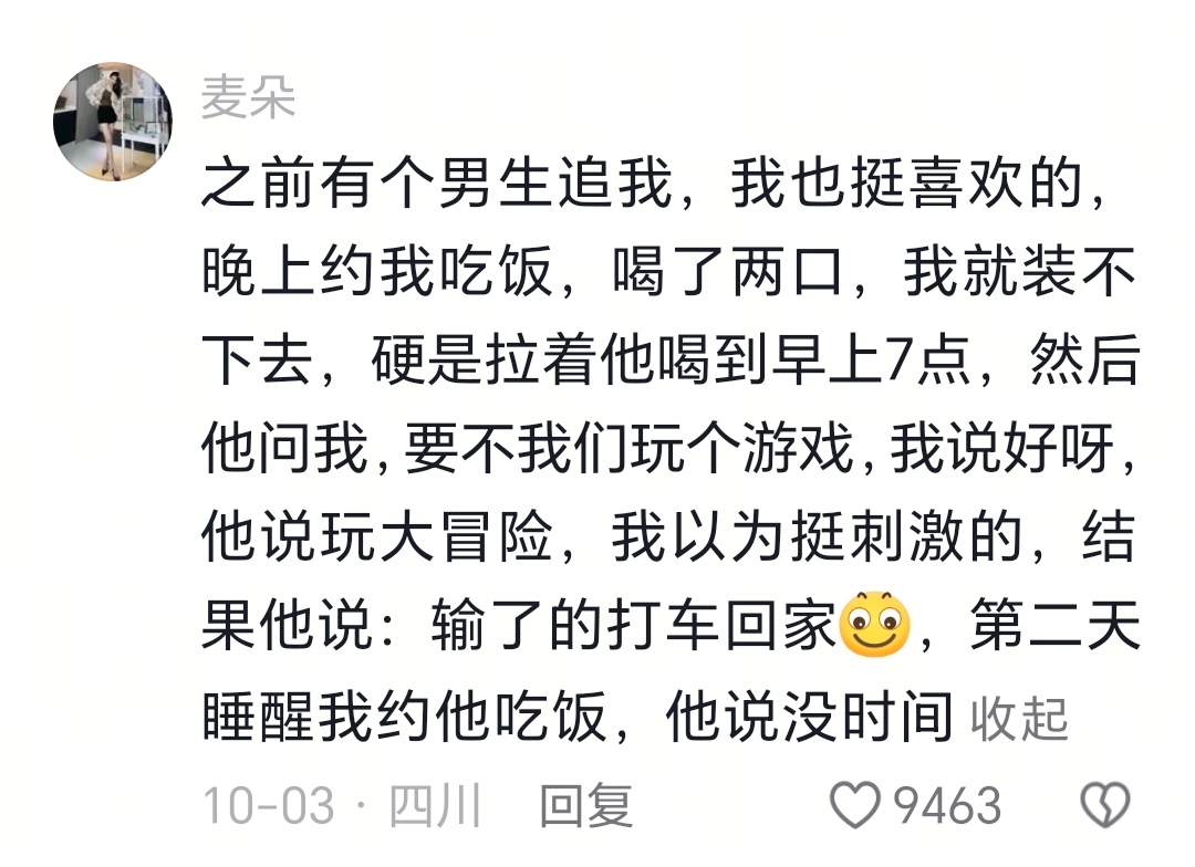 我原来的一个女同事,比较open,属于情史极混乱的,前前后后交了20几个男朋友。