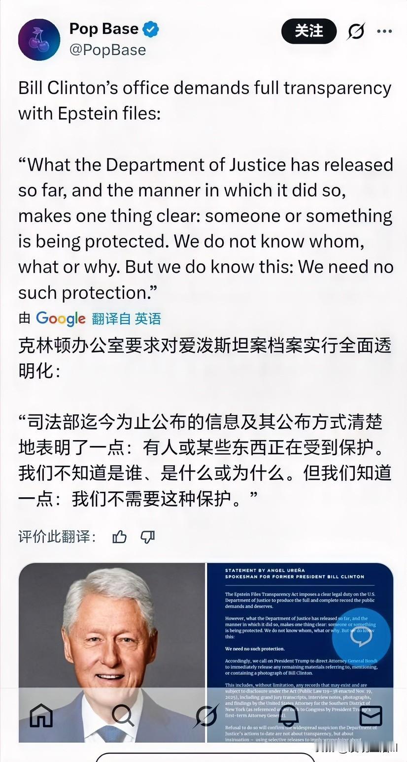 克林顿要求全面公开爱泼斯坦档案。他感觉这样断章取义,有选择的公布档案,是对自己的伤害。 克林顿干了一辈子政治,还是不明白政治:他们让你看到的,其实正是他们想让你看到的。 特朗普可没闲功夫八卦,人家这叫项庄舞剑,意在沛公,矛头指向的是民主党。