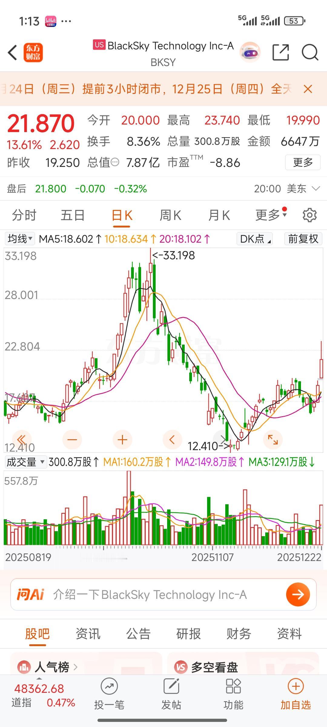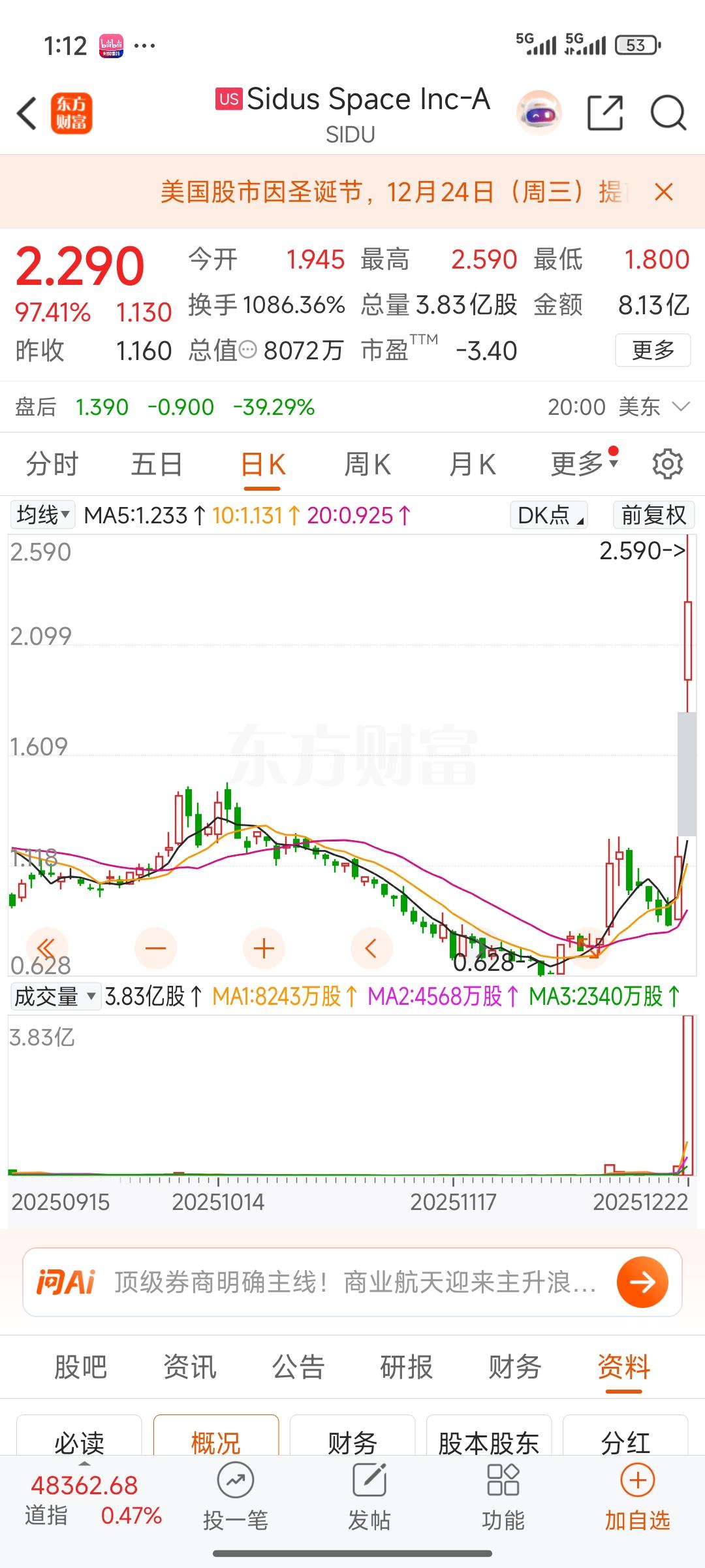 今天可热闹了,连续上涨一两个月的航空航天概念股进入调整阶段。再看美股,相关航天概念股竟在一天内接近翻倍,比A股还要疯狂。考虑到SpaceX准备明年上市,我认为航空航天概念股肯定会有第二波行情。大家可以密切关注,思考是在春节前布局,还是春节后入场。