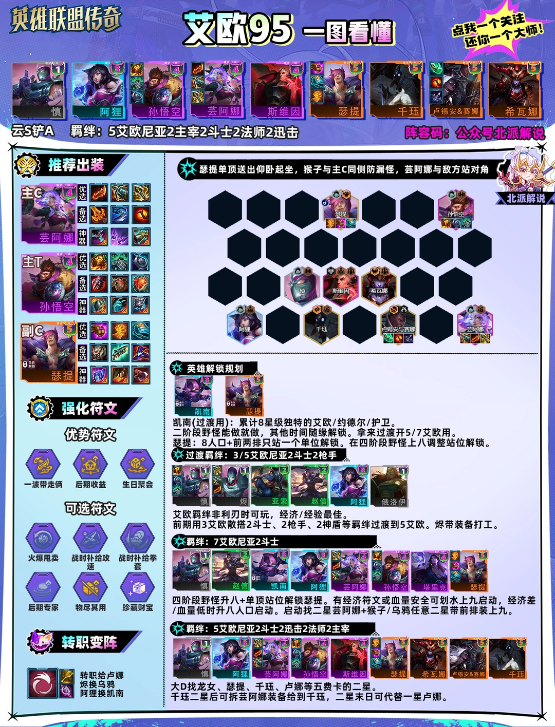 阵容强度:云S铲A 推荐开局糊3艾欧+慎/烬任意二星+装备合适时玩。 最佳艾欧开局是繁荣/启迪最舒服(打钱/经验),实际只要不是利刃都能玩(利刃只对芸阿娜有提升,其他多少有基础属性) 构筑中烬2枪手的提升不如阿狸2法师为全队加法强,且阿狸单卡质量够高。 因为是95,大数据比8D的闭环芸阿娜要好些,瑟提很克制版本大热的皎月。 95能直接上到九启动是最好的,上不到则迫降成八人口的闭环芸阿娜攻略/一图流或D核心卡的质量再上九,糊艾欧开局在这两套摇就可以。 阵容构筑: 慎、阿狸、芸阿娜、猴子、乌鸦、瑟提、龙女、卢娜、千珏 组成羁绊: 5艾欧尼亚2斗士2法师2主宰2迅击 千珏二星后拆芸阿娜的装备给千珏 解锁弈子: 凯南(过渡用):累计8星级独特的艾欧/约德尔/护卫。 二阶段野怪能做就做,其他时间随缘解锁。拿来过渡开5/7艾欧用。 瑟提:八人口+前两排只站一个单位战斗解锁。 推荐在三阶段野怪上八调整站位解锁; 战斗阶段单顶解锁一定要看主C同侧左1右1有没有敌方战士,不躲对侧要掉大血。 装备推荐: 主C芸阿娜:羊刀+海妖+无尽/巨杀/杀人剑 攻速流后排C核心装羊刀+海妖,羊刀可以用红霸服代替。 芸阿娜技能真伤在暴击时有额外伤害,无尽对芸阿娜是好装备。 目前无尽有额外伤害的bug,但同质量下装备优先级不如二星千珏/卢娜。 奥恩神器:讯刃/暗裔之弓(代替羊刀)收集者(代替海妖) 光明装备:光海妖最佳,其次光无尽 主T猴子:日炎+薄暮+振奋/反甲/血手 阵容做前排装优先级不高,后期随便能补满三件就行。 上九需要养的C太多,功能装也优先做轻语、红给后排卢娜当输出装用。 副C瑟提:法爆+正义+破防/泰坦/帽子/巨杀 核心装法爆和正义必备,正义做不出可以用科技枪代替。 饮血剑有护盾反而减慢做仰卧起坐的时间,是很差的装备。 第三件破防最佳,泰坦能轻松叠满+免控也适合,还可以选择巨杀、帽子、大天使。 瑟提伤害占比90%以上是真伤,出伤不需要减魔抗。 后期C千珏:羊刀+海妖+杀人剑/巨杀 后期C卢娜:无尽、红霸服/鬼书、轻语、青龙刀/蓝霸服、杀人剑