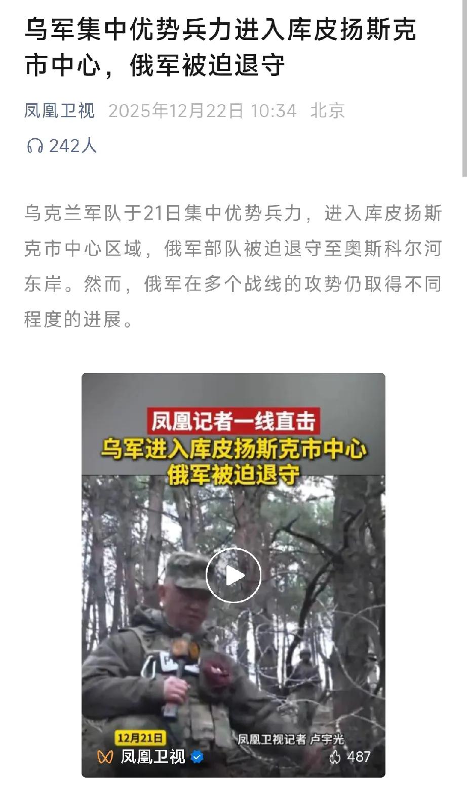 乌克兰又打回来了! 乌克兰军在12月21日一天时间内,反攻俄军占领的库皮扬斯克,并抵达该市中心区域: 结果俄罗斯军被打到了库皮扬斯克市的奥斯科尔河对岸,而且俄罗斯军这轮一进一出行动所遭受的损失也可想而知。 之前泽连斯基在库皮扬斯克市发布照片,现在看来是有些根据的。