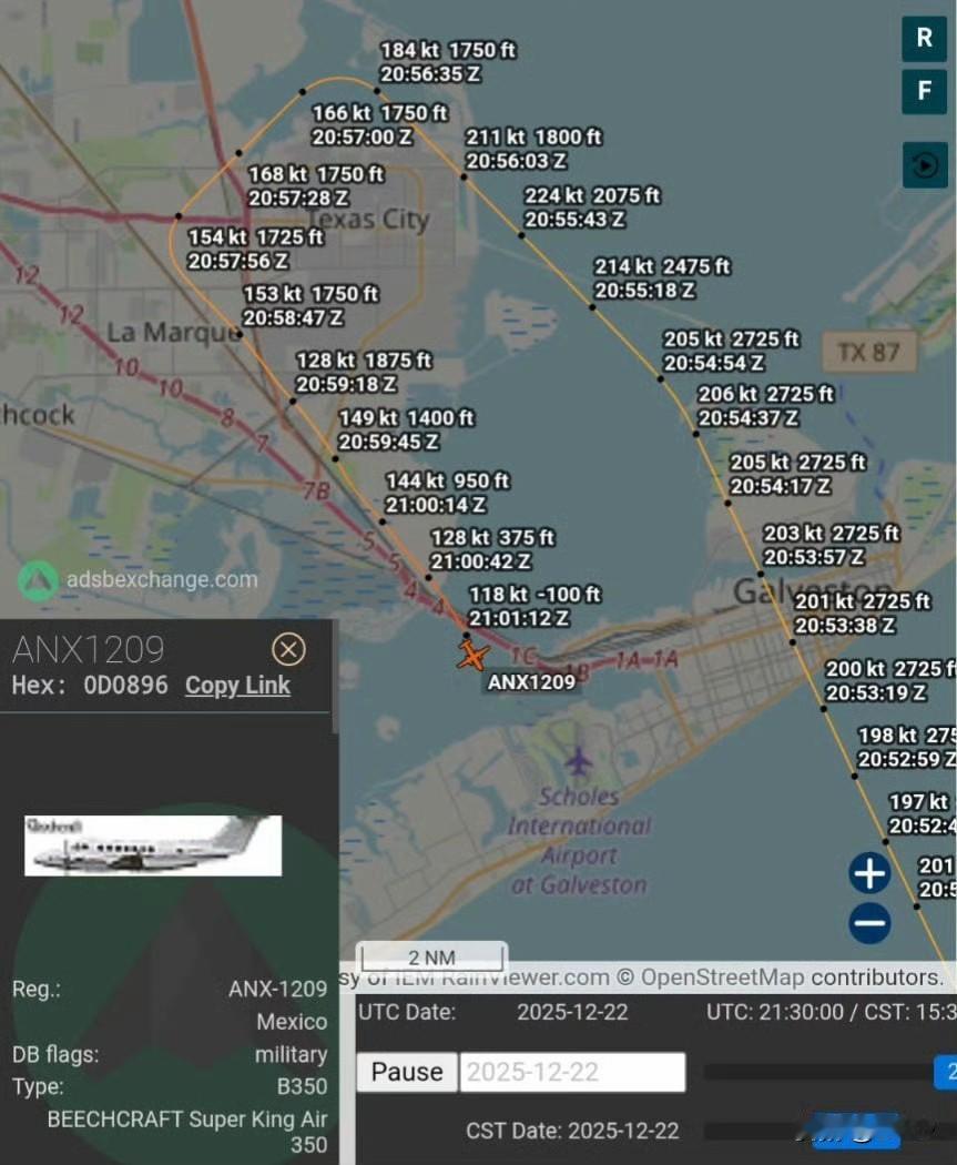 一架墨西哥海军比奇空中国王 350i 型飞机于 2025 年 12 月 22 日在执行人道主义医疗转运任务时,因大雾天气在飞近斯科尔斯国际机场过程中坠入德克萨斯州西加尔维斯顿湾。该机从墨西哥梅里达起飞,机上载有八人,包括两名飞行员、医护人员及乘客。机上有一名儿科烧伤患者正由墨西哥非营利基金会协调转运至德州 Shriners 儿童医院接受专业治疗。目前已确认至少三人遇难,搜救行动仍在进行。有报道称幸存者已被送往当地医院救治。