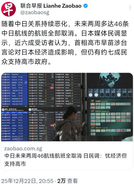 新加坡联合早报昨晚(12月22日晚)报道:“随着中日关系持续恶化,未来两周多达46条中日航线的航班全部取消。日本媒体民调显示,近六成受访者认为,首相高市早苗涉台言论对日本经济造成影响,但仍有约七成民众支持高市政府。” 这可不是小范围的航班变动,涉及的城市特别广,咱们这边像上海、成都、重庆、武汉、西安这些热门出发地都在列,日本那边则覆盖了大阪、名古屋、福冈、札幌等十几个城市。 单说上海,就有14条航线直接停飞,是取消最密集的城市;大阪关西机场更是有超过10条中方直飞航线被叫停。 目前各大航空公司都已经启动了集中退票,估计得有44万多人的出行受到影响,年底这段时间的退票高峰是躲不开了。 说白了,这么大规模的航线取消,和近期中日关系的降温直接挂钩,根源还是日本首相高市早苗的涉台言论。 之前她在国会公然喊出“台湾有事就是日本有事”,这种触碰中方红线的说法,直接让两国关系变得紧张起来。 就在12月21日,还有日本自民党官员高调窜访台北,中方当天就提出了严正交涉,没想到紧接着就出现了航线全取消的情况。 这种紧张局势已经传到了日本国内,最新的民调数据看得人挺清楚。 有近六成的日本受访者都觉得,高市早苗的涉台言论会给日本经济带来负面影响。 这也不难理解,要知道中国游客占外国访日游客的四分之一左右,人均消费还比其他国家游客高,现在航线一断,年底本应是旅游旺季,日本的旅游业、零售业肯定要受重创,有机构预估春节前两周日方旅游业损失就可能达数十亿人民币。 不过有意思的是,民调里也藏着分裂,虽然大家担心中经济,但还是有不少人支持高市内阁,只是支持率已经比11月下跌了2.4个百分点。 还有三成多受访者觉得高市的涉台言论是“失言”,不支持她的人里,有不少是觉得她“缺乏国际观”。 这么看,日本民众心里也挺矛盾,一方面怕经济受影响,另一方面又没完全放弃对现政府的支持。 其实这事儿的影响还不止于旅游和出行,中日航线本来承担着大量的人流和物流,现在突然中断,不仅普通人出行受影响,两国的商务合作、产业供应链都可能跟着出问题。 之前就有日本经济学家预估,要是中国游客大幅减少,日本GDP可能会被拉低0.36%,经济损失高达上千亿人民币。现在航线取消,无疑是让这种担忧变成了现实。 这么说吧,这次46条航线全取消,更像是一种明确的信号,中方在台湾问题上的底线从来都很清晰,任何外部势力干涉都不会被容忍。 高市政府想把台湾问题当成政治筹码,却没考虑到普通民众和企业要为这种激进政策买单。 现在日本的经济团体已经在呼吁恢复和中方的合作,要是日方还不收敛,后续两国的交流可能还会受到更多影响。 最后提醒一句,近期有中日出行计划的朋友,一定要密切关注航司的退改通知,及时调整行程,至于中日关系后续会怎么发展,还得看日方接下来的态度。 以上都是个人观点,对此你有什么不同的看法,可以在评论区留言讨论!!!