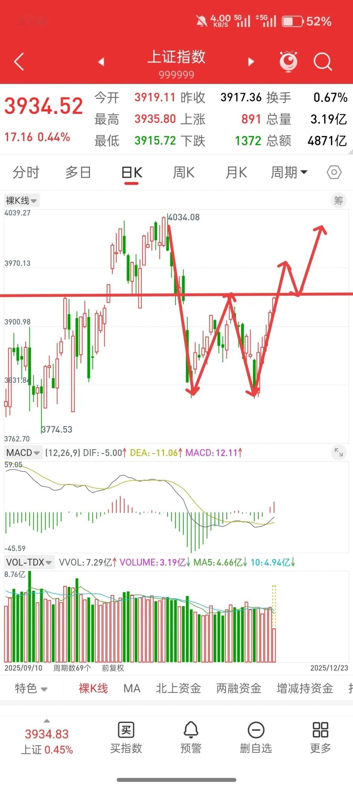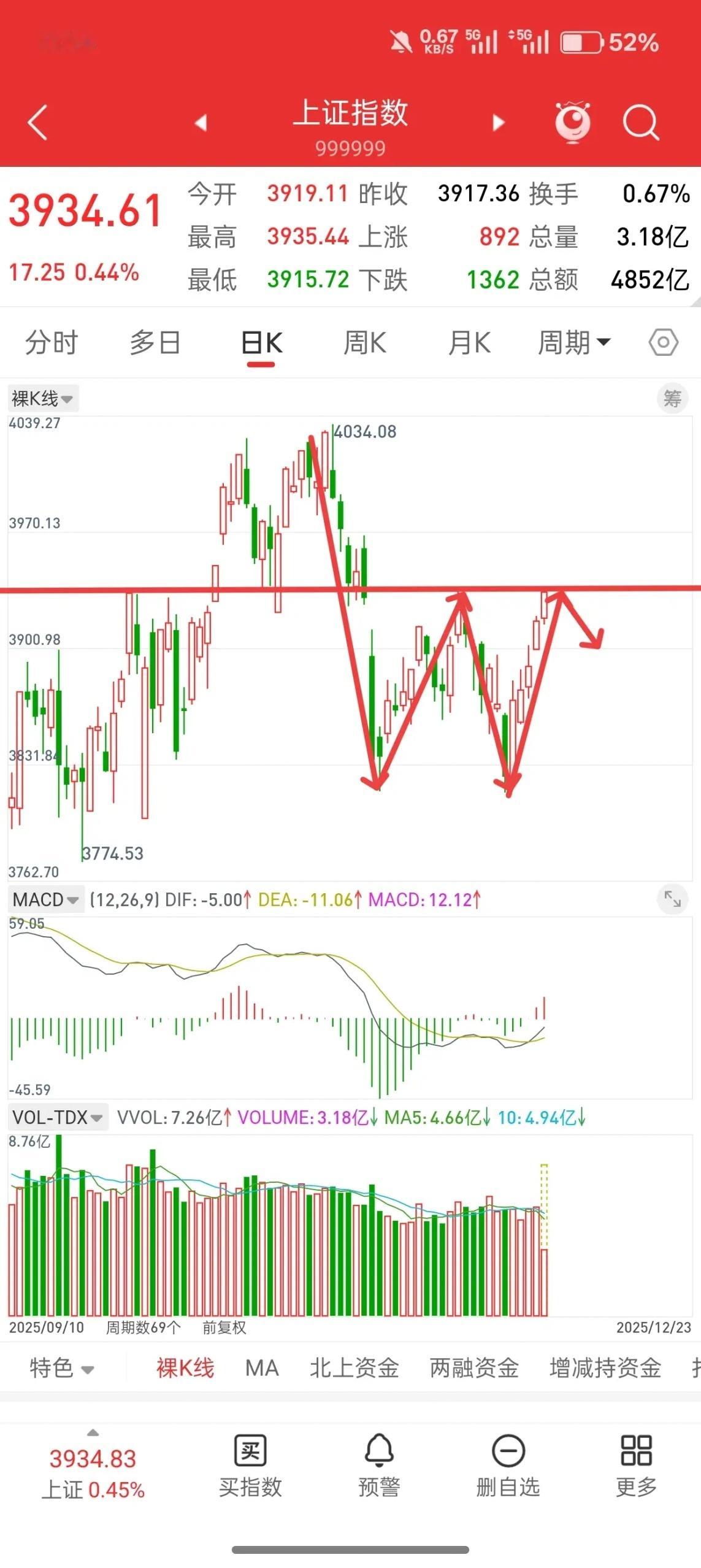 A股,触及关键位置,是反弹末端还是反转?先说观点,今天如果能放量突破3936颈线压力,且收盘站稳3936,就可以认为是反转的标志,后期且回踩不破3636,后市可期!如果今天盘中只是摸一下3936,且收盘站稳不了3936,这里需谨慎,不要轻易追。跟12.8号一样,摸一下3936没用,必须放量站上,且收盘站稳,如果只是盘中摸一下,收盘前再收个长上影线,那是没用的。就这么简单!
