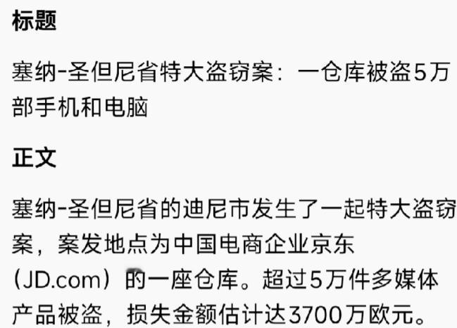 京东仓库被盗,3700万欧元(3亿人民币)货物被盗!震惊全欧洲! 据悉,中国电商企业京东位于塞纳-圣但尼省迪尼镇的仓库遭到洗劫,这座距离巴黎市区约17公里的物流枢纽,一夜之间引发欧洲物流及安防领域的广泛关注。 具体情况是这样的,当地时间周一早上,仓库负责人去巡查,一进门就傻了眼,大门被暴力撬开,好几处入口都有被破坏的痕迹,再一清点货物,足足30个托盘的商品没了踪影。 查下来更让人揪心,被盗的全是高价值的电子产品,总共50456件,基本都是荣耀和OPPO的手机、平板电脑、笔记本电脑,还有少量耳机,其中九成以上都是手机和平板这类大件。 更可怕的是,窃贼明显是有备而来的专业团伙,仓库里的视频监控系统被人为破坏了,案发当晚的监控根本没法用,更关键的是,报警系统居然全程没正常工作,等于整个仓库的安全防线形同虚设。 这么大的动作,全程没触发任何警报,想想都让人后背发凉。 现在法国司法部门已经立案调查,把这案子定性成了有组织盗窃、销赃加结伙犯罪,还专门派了打击有组织犯罪的警力来接手。 目前警方正在调取仓库外围的监控,想靠这个还原作案过程,找到嫌疑人的行动轨迹,但能不能顺利破案、追回赃物,现在还不好说。 这么说吧,这时候出事对京东来说太致命了,眼看就是圣诞消费旺季,这个仓库本来就是京东保障欧洲旺季供货的关键节点,现在核心货物丢了,后续肯定会出现订单延迟交付、促销活动没法正常推进的问题,搞不好还会丢一大批客户。 再往深了想,这次失窃也暴露了不少问题,案发的塞纳-圣但尼省本来就是巴黎出了名的治安重灾区,高失业率加上地下经济活跃,就算有警力部署,管控起来也很困难。 京东当初选在这里布局仓库,大概率是权衡了交通便利或者租金成本,但现在看来,把核心仓储放在安全系数这么低的区域,风险实在太大了。 对整个跨境电商行业来说,这也是一堂昂贵的风险教育课。 现在很多企业都在往海外扩张,海外仓库成了核心基础设施,但往往容易重扩张、轻防护。 说白了,海外运营不光要考虑市场和成本,安防投入、保险配置、本地化的安全管理这些都得跟上,不然再大的生意,一次这样的失窃就可能伤筋动骨。 目前京东还没对外详细回应这事,但后续怎么处理、怎么弥补损失、怎么重构海外仓库的安防体系,都是大家关心的问题。 毕竟3个亿的损失是小事,要是砸了在欧洲市场的口碑,后续想再站稳脚跟就难了。 以上都是个人观点,对此您有什么不同的看法,可以在评论区留言讨论!!!