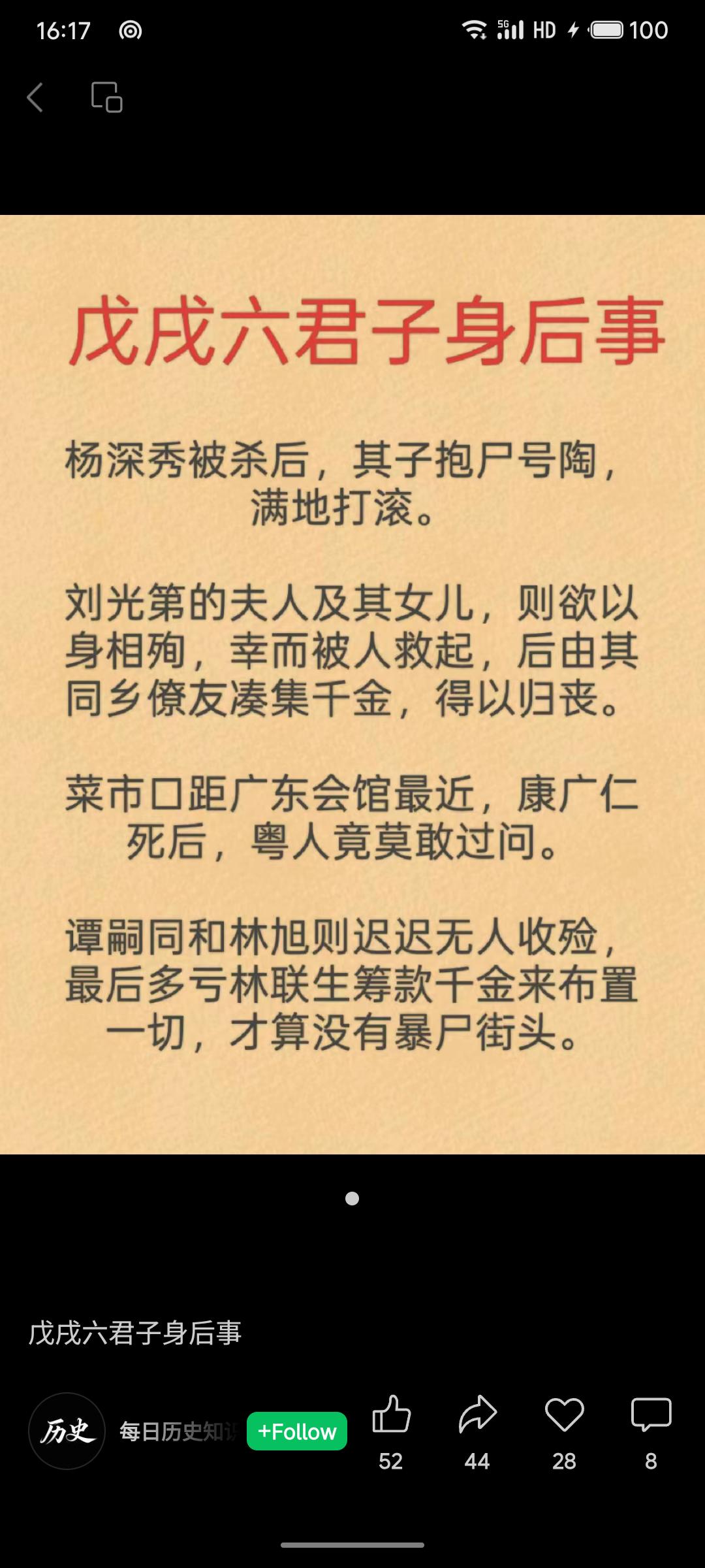 戊戌政变后,六君子于菜市口就义。身后凄凉:杨深秀之子痛哭收尸,刘光第妻女获救后赖同乡凑资归葬,康广仁无人敢问,谭嗣同、林旭幸得林联生筹款收殓,免于暴尸。