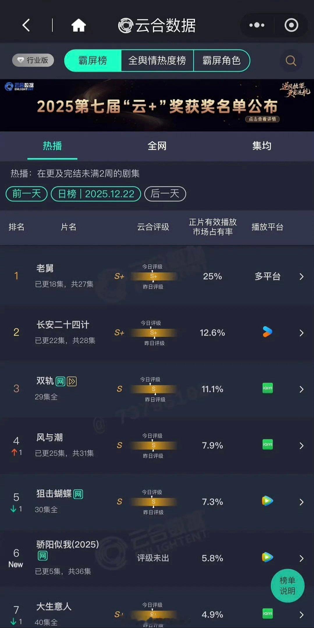12.22云合: 老舅25% 长安二十四计12.6% 双轨11.1% 骄阳似我5.8%