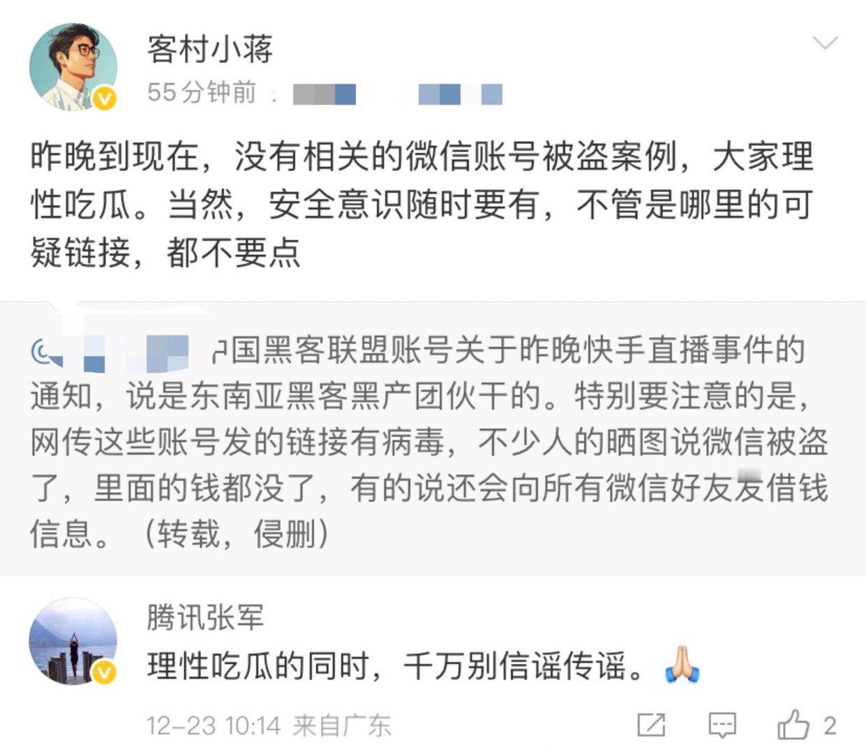 因为快手这事,微信也被迫回应了。快手遭到黑灰产攻击,没想到还把微信牵扯了进来,昨天不少人晒图说微信被盗了,里面的钱都没了。今天一大早,微信员工及时回应,称昨晚到现在,没有相关的微信账号被盗案例。腾讯张军也呼吁大家理性吃瓜,千万别信谣传谣。昨天确实刷到不少人在说微信被盗的事,但感觉这事大概是假的,因为无论是谁干的,要是有这个水平直接干微信,为什么要绕着去快手?不是说腾讯技术有多牛,因为以前QQ确实有过账号被盗的事,但微信应该可以说是国内最安全的软件了,至少目前还没听过被盗的事例。所以,趁乱带微信的节奏,不会又是商战吧?