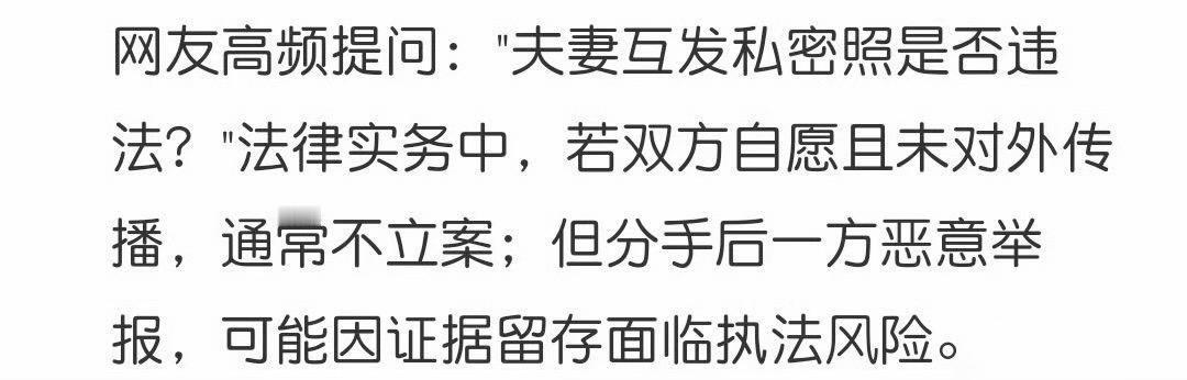 明年起,私发好友淫秽信息真要被拘留罚款了!新修订的《治安管理处罚法》把私密传播也纳入监管范围。 大家最关心的就是情侣夫妻间的私密互动,互发私密照片视频算不算违法?律师说关键看社会危害性,自愿私密分享且不扩散,一般不追责,但分开后拿记录报复举报就难说了。 但是让人担心的来了,夫妻好友间互相发的内容,又不公开怎么发现得了是淫秽信息呢?第三方监控聊天记录?会不会有泄露隐私的风险? 话说回来,与其管这些无伤大雅的,不如多关注一下重要的,比如食品安全、医疗安全,这才是民生大事。