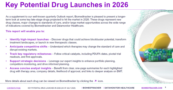 近日,医药研发追踪机构Biomedtracker发布的《2026年关键潜在药物上市报告》中,纳入2025年7月前处于3期或更晚阶段的候选药物,核心筛选依据包括产品上市审批决策节点、监管申报动态以及3期或关键试验数据读出等关键信息。
