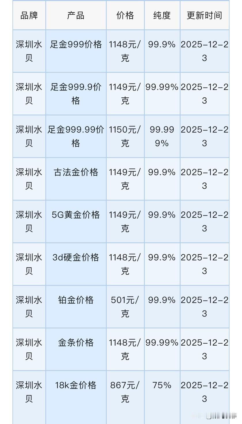 今天水贝黄金批发价格也涨爆了! 快来看看涨了多少? 足金999价格涨1148元/克, 足金999.9价格1149元/克, 足金999.99价格1150元/克, 铂金价格501元/克, 金条价格1148元/克。 水贝黄金指发市场今日报价为每克 1148元,工费另计,不同的黄金款式工费有所差异(每克10元至35元不等)。 为什么水贝黄金这么便宜,因为水贝是中国珠宝集散地,主要是批发为主,都是金价加工费,而且运营成本也低,所以很便宜。 所以信息都是提供参考价值! 购买黄金有风险,投资需谨慎!