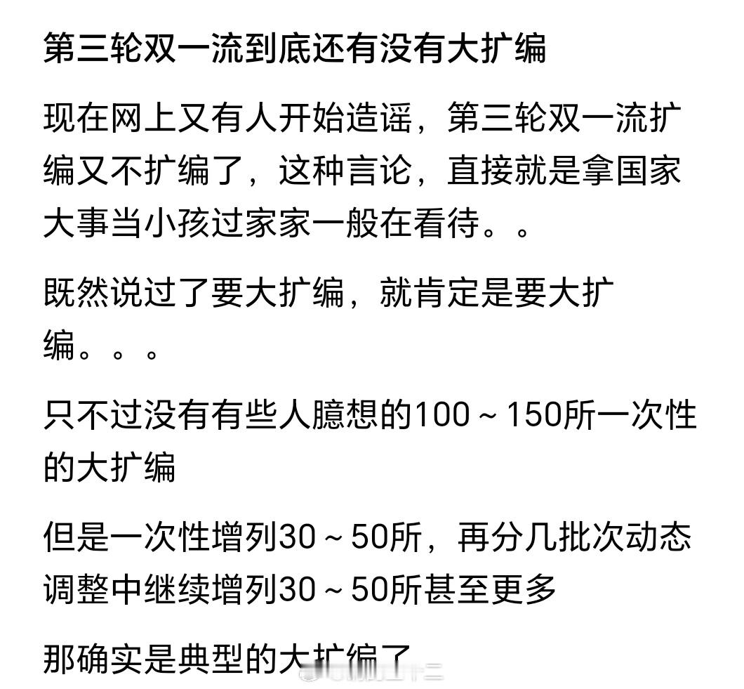 第三轮双一流建设要扩编一事确认。“适度扩大双一流建设范围”,注意是“范围”,不是“规模”,因为如果用“规模”,很直接的就能指向“单纯扩大学科规模”,KPI比扩大“范围”要容易“实现”的多。可以跟我刚刚的观点对照着看,双一流建设高校肯定要显著扩编,只不过,不是一次性扩编100~150所,而是一次30~50所的扩编 ,小批量多批次,快速推进优质大学扩编扩容。。最后双一流大学数量多了起来,才能“动态调整,能上能下”,到那个时候,效率比较高的大学经费都凑合可以了,就该拼实力与产出了。