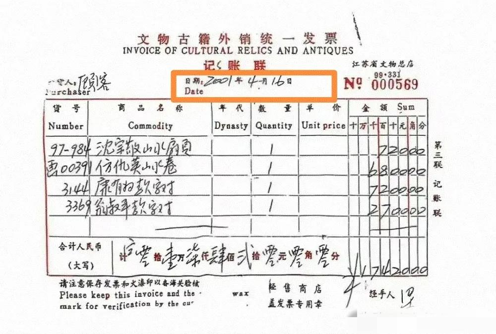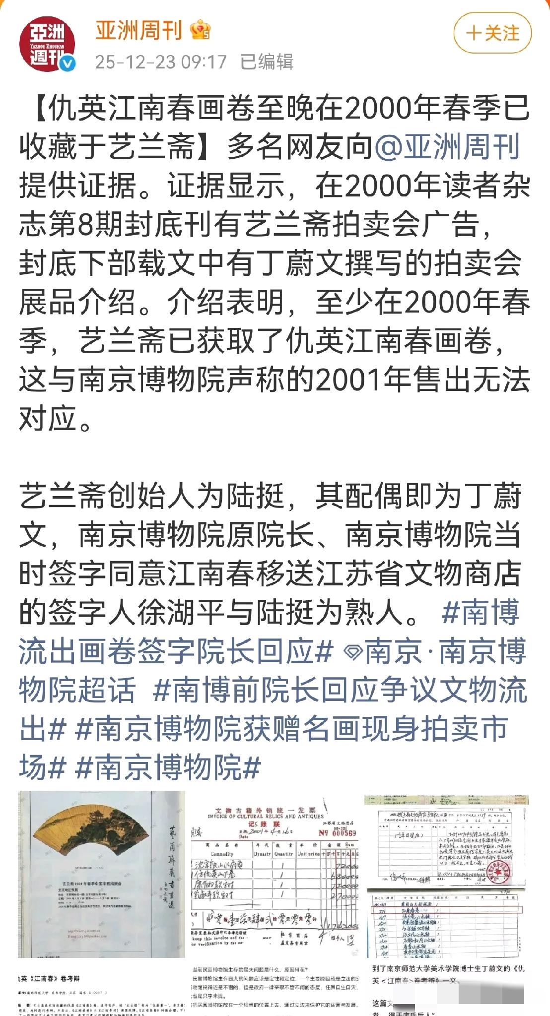 《亚洲周刊》再添新证据, 南博之前的声明又被打脸, 原来早在2000年的时候,仇英的《江南春》画卷就已经在艺兰斋了。 好家伙,看来之前网友们的猜测果然成真了,南博出具的2001年售卖《江南春》的发票抬头怪不得是“顾客”呢,看来这是先上车后补票,不敢写真名也不敢写假名,那么价格6800元是否是真实售价? 早在2000年艺兰斋举办的春季中国字画拍卖会上,宣传的广告封面底部就有着《江南春》的介绍,也就是说,那时候陆家就已经持有了,只是当时拍卖展示的是仇英的另一幅《青山楼阁》。 这回是彻底解释不清了,南博之前想用出售发票以证清白,没想到日期都搞错了,没道理是手误吧,年份都能写差,这该有多不严谨。 值得一提的是,当年时任副院长的徐湖平同时还是收藏协会的会长,而持有《江南春》的陆家陆挺,也是该协会的顾问,二人是同个圈子的人。 看来,还是潮水退去大家才知道到底谁在裸泳。