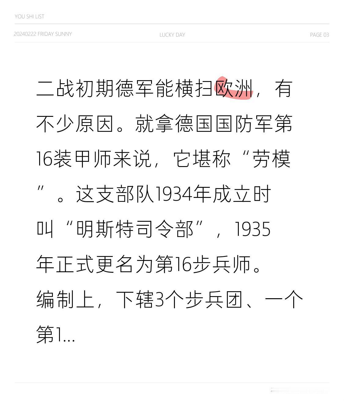 二战初期德军能横扫欧洲,有不少原因。就拿德国国防军第16装甲师来说,它堪称“劳模”。这支部队1934年成立时叫“明斯特司令部”,1935年正式更名为第16步兵师。编制上,下辖3个步兵团、一个第16炮兵团及一些直属单位。 闪击波兰时它没参战,在C集团军群与法军对视、“晒衣服”。1940年法国战役,它作为步兵师跟不上装甲师推进节奏,基本在后头捡漏。 除了像第16装甲师这样的部队,德军步兵班组配置也很厉害,作战能力强大。多种因素综合,让德军在二战初期能在欧洲横行。