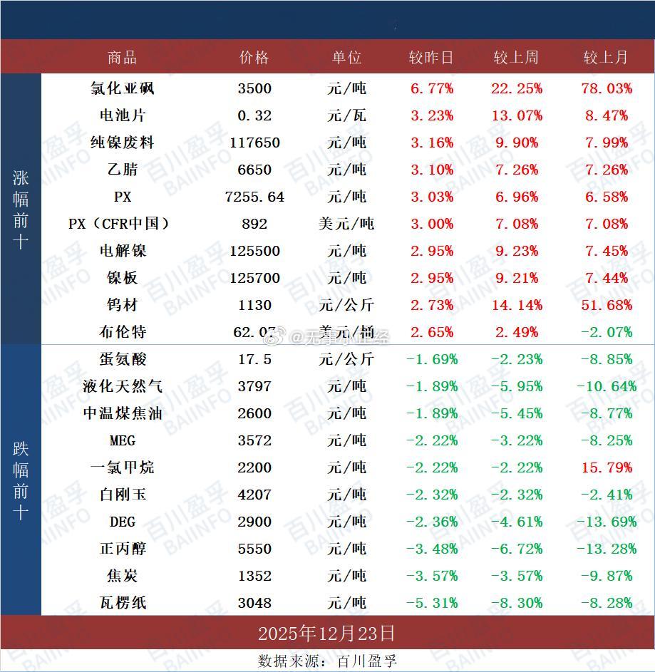 1223今天大宗商品、化工、有色涨跌表!真猛…