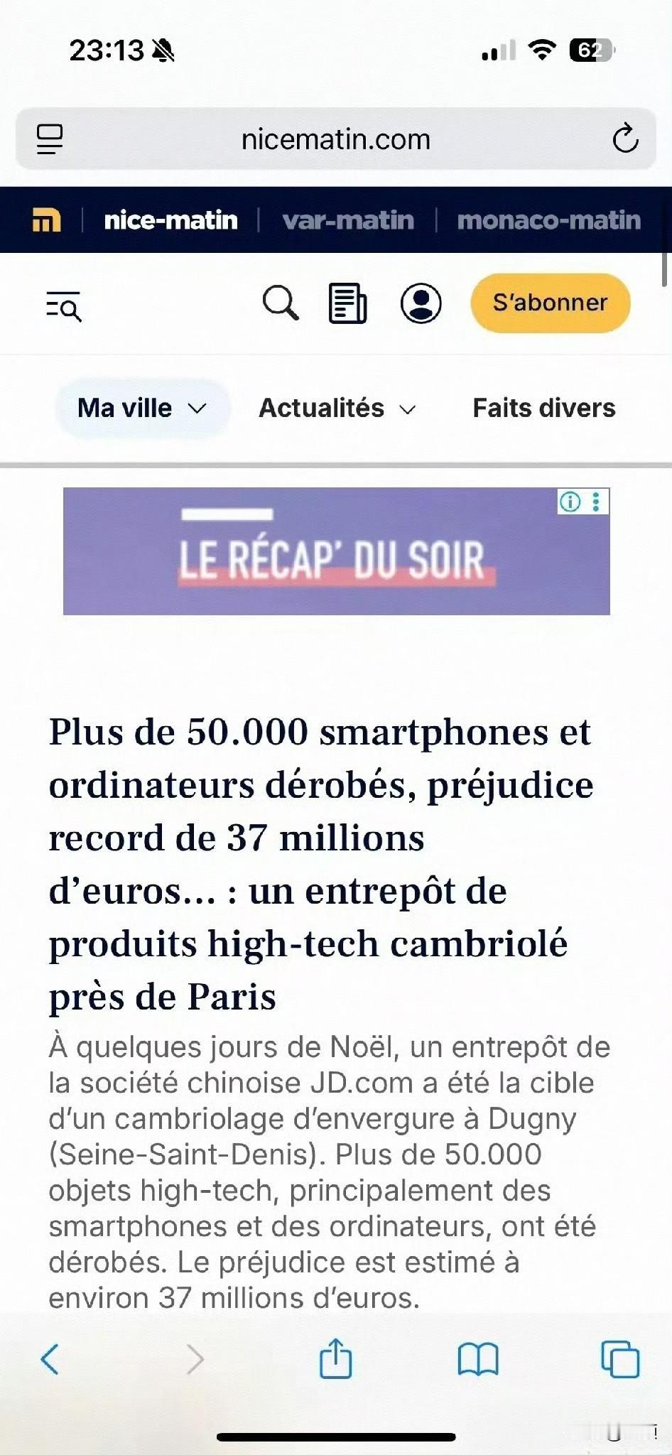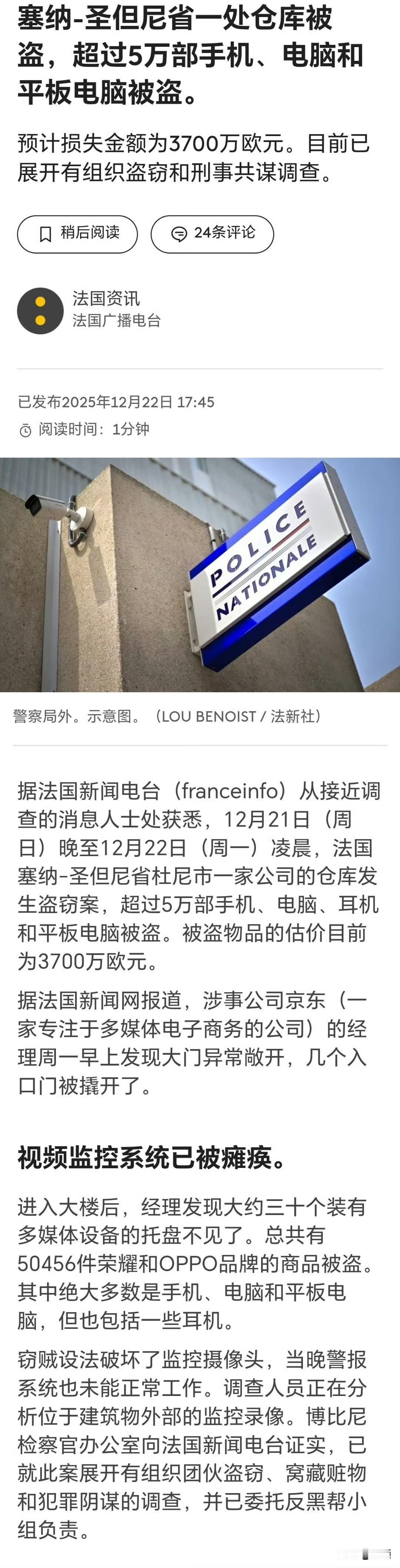 京东巴黎仓库遭3亿失窃,5万件电子设备一夜被盗……当地时间12月22日,京东位于巴黎北郊塞纳-圣但尼省迪尼镇的仓库发生重大盗窃案,30托盘、超5万件荣耀与OPPO电子设备被盗,涉案金额达3700万欧元(约合人民币3.06亿元),被法国犯罪调查局(BRB)列为“年度最重商业盗窃”。 窃贼于21日深夜至22日凌晨作案,先破坏监控与报警系统,再卸下仓库大门,不到三小时便用叉车将货物转运至冷柜车,现场痕迹被清理干净。据悉该仓库为2024年投用的亚太枢纽,圣诞季将高价值货品集中堆放于一层,且案发地周边存在成熟跨国销赃链,警方已将“内鬼”列为重点调查方向。 目前京东已将后续圣诞货品紧急转运至德国科隆仓,预计27日恢复上架;警方正追查巴黎至罗马尼亚的“电子走廊”销赃线路。此次事件也为出海企业敲响警钟,海外安防需适配当地实际,而非简单复制国内模式。