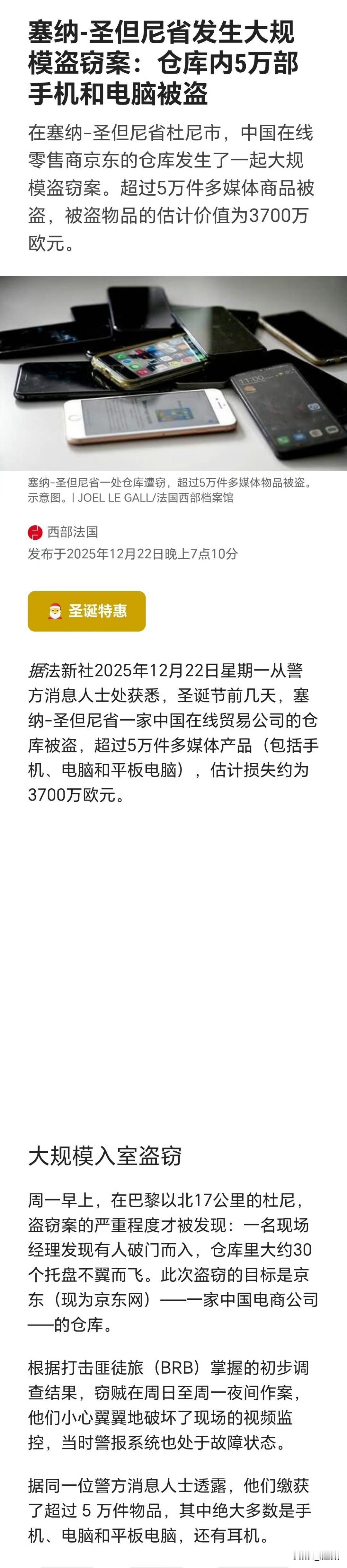 京东巴黎仓库遭3亿失窃,5万件电子设备一夜被盗……当地时间12月22日,京东位于