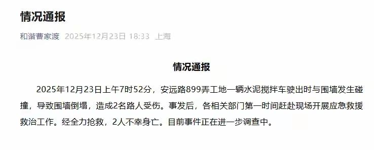 悲剧,只在一瞬间。一次疏忽断送2人生命!事发上海静安区。今天(12月23日),有网友爆料称,上午7点52分左右,在静安区安远路899弄工地突发一起悲剧,一辆水泥罐车在倒车时与工地围墙发生碰撞,导致围墙倒塌,巧合的是当时正有2名路人经过,躲避不及,被砸倒在地。据官方通报,经全力抢救,受伤2人已不幸身亡。 评:上海静安区工地的悲剧令人痛心,水泥罐车倒车撞墙致两人身亡,既是生命的逝去,更暴露了施工安全管理的漏洞。根据相关规定,工程车辆作业需设专人监护、划定警戒区域,倒车盲区更应采取反光镜、警示装置等防护措施 。但这场事故显然未能落实这些基本要求,折射出部分工地对安全制度的漠视。从车辆进场核查到现场作业监管,从操作人员培训到应急预案制定,任何一个环节的失守都可能酿成惨剧。生命安全重于泰山,《建设工程安全生产管理条例》早已明确各方责任 。相关部门需彻查事故原因,严肃追责;所有施工单位更应引以为戒,将安全规范落到实处,让“安全第一”不再是口号,而是守护生命的坚实屏障。热点 安全警钟 上海一工地今天发生一起安全责任事故致2人死亡