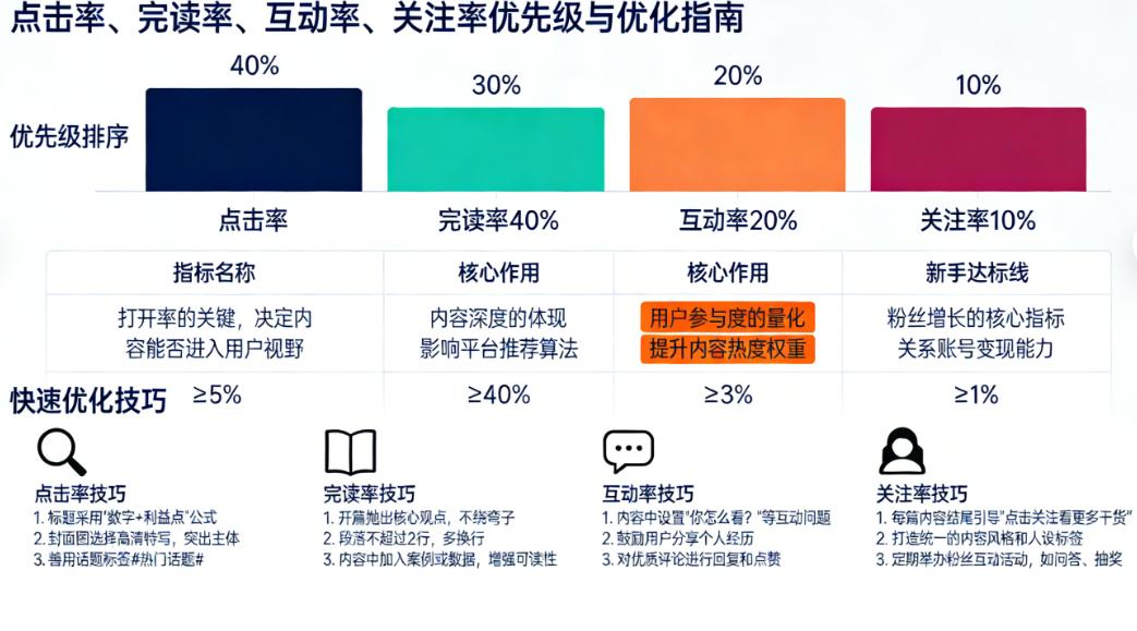 4个核心数据,直接决定了内容有没有流量 不少人因为没有阅读量,都天天记得睡不着觉啊。 我也睡不着,因为没有阅读量就没有钱。 没有钱就没有继续更新下去的动力。 没有动力,就面临着断更。 看着好像写作很轻松,随便写当然很轻松。 但是当有了流量压力之后,那可就不轻松了。 那如果没有流量该怎么办呢?首先咱们需要先明白,为啥没流量? 影响阅读量的到底是什么?咱们接下来就细细研究。 影响阅读量的因素根据优先级依次是点击率,完读率,互动率,关注率。 也就是说,点击率是最重要的,其他三个都没有它重要。 什么都不解决的情况下,它必须先给解决了。 那么如果点击率不好,需要重点关注的就是标题和封面。 因为这是别人点进来的关键,标题设计的一定要吸引人,再吸引人。 能够直接就触碰到别人的痛点,然后内容可以把问题解决,读者就成为粉丝了。 第二重要的是完读率,也就是别人能够把你的内容读完。 如果读不完,也是不会推荐的,所以内容一定要排版清晰。 同时开头设计就要把读者深深的吸引住,让他能够愿意持续的读下去。 那么开头钩子的设计和短句的排版就是关键中的关键。 之后就到了互动率了,互动率的决定性因素其实是内容。 你的内容好,评论点赞收藏就会越多,反之则越少。 而且评论在这里的权重往往最高,也就是评论大于收藏大于点赞。 这也就是为什么很多人的内容在结尾都会让大家去互动的原因。 最后一个就是关注率,关注率说白了就是获取精准粉丝的能力。 如果你的内容正好是被推送到目标粉丝面前,而且他还关注了,说明什么? 说明你的标签超级精准,选题能力,内容写作能力都是非常优秀的。 只需要持续不断的创作,一定可以越来越好。 最后记住四句话: 点击完播是敲门砖,有它俩流量翻番,评论收藏是放大器,有它俩能赚人民币!