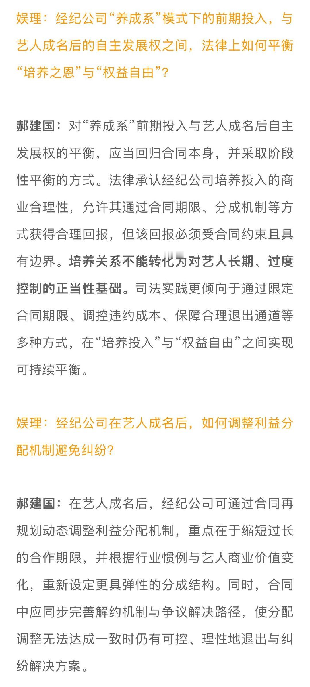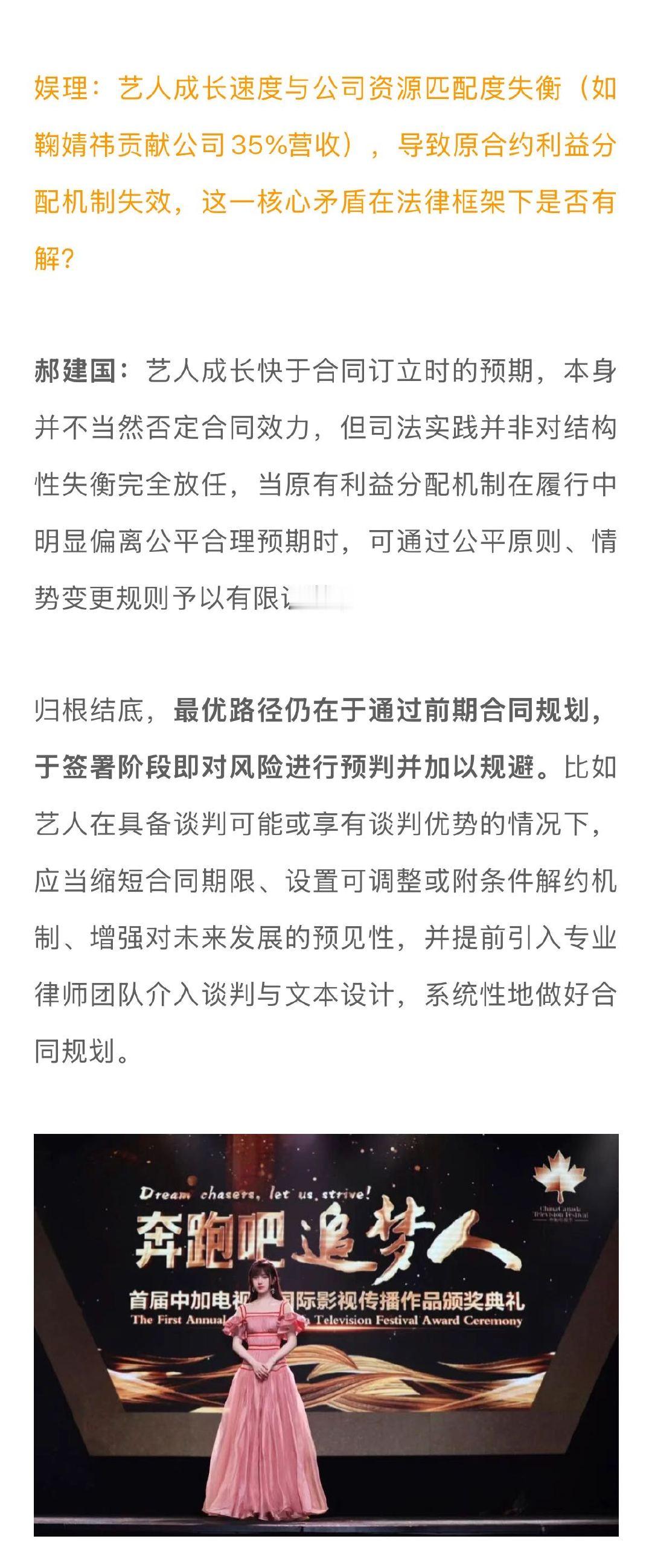 律师谈鞠婧祎丝芭合约纠纷 律师谈新人签约注意事项 当艺人成为成熟艺人,和经纪公司之间关于收入分成的矛盾点就会越来越多。比如鞠婧祎和丝芭传媒两方之间的纠纷虽然涉及到了合约细节,需要法院审理,但矛盾根源在于艺人发展和公司资源的不匹配。谈及艺人成长速度与公司资源匹配度失衡,导致原合约利益分配机制失效的核心问题,律师郝建国直言:最优路径仍在于通过前期合同规划,于签署阶段即对风险进行预判并加以规避。娱理独家↓