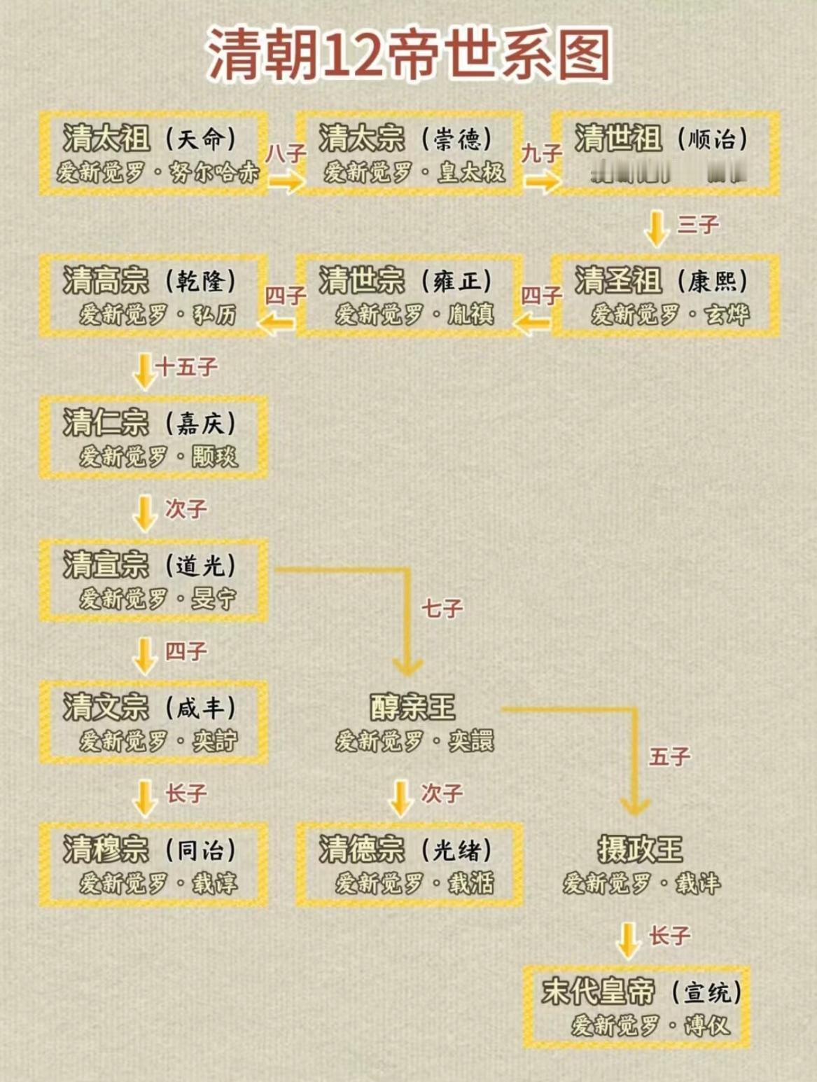 清朝11世12帝世系表。 清朝的帝系传递并没有什么规律,并非像嫡长子继承制那样比较稳定,主要是皇帝觉得那个皇子可以,就让那个皇子继位,清朝皇帝之中,也就是道光帝(皇子中排序第二)是嫡长子出身。 也不是清朝不想用嫡长子继承制,康熙帝曾经就尝试过嫡长子继承制,立嫡次子胤礽(嫡长子早夭,实际上的嫡长子)为皇太子,最后却是失败告终,之后雍正帝搞出了秘密立储制度,后面皇帝觉得挺不错的,就不再尝试嫡长子继承制。 不过虽然清朝的帝系传递不是那么有规律,但是整体还可以,大体是直线传承,兄终弟及的情况也就是同治帝和光绪帝一例。 清朝 皇子 嫡长子