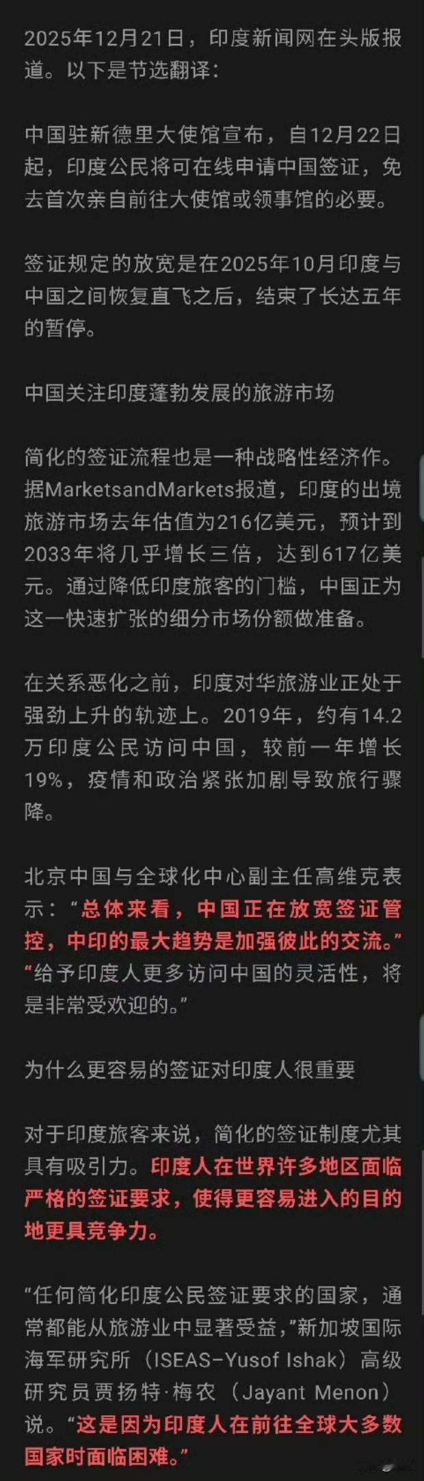 中国驻印使馆12月22日起启用赴华签证在线申请系统 便利印籍人士入境……据印媒及国际媒体报道,中国驻印度使馆自2025年12月22日起正式上线赴华签证在线申请系统,覆盖旅游、商务、学生、工作等常见事由。申请人可线上填表、上传材料并完成预审,仅需赴签证中心递交护照与采集生物信息,大幅减少往返与等候时间;审核标准、签证种类与停留期不变,同时保留线下服务。此举配合中印直飞恢复与双边关系缓和,旨在提升经贸与人文交流效率。