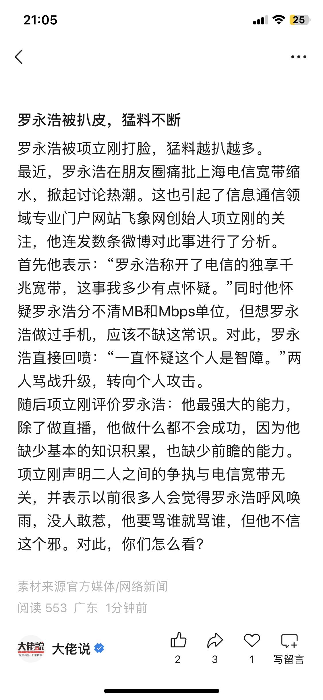 罗永浩也真是作贱自己,搭理项立刚这小家伙干嘛?罗永浩是今天互联网流量顶流,项立刚这东西只是自媒体赚每天几个肉包子生活费的失业老年人,他既没有文化也没啥教养,属于打砸抢那一代人长大变老了。罗永浩根本不用搭理她,随他吠。狗咬人难道人要咬回去?请罗永浩好好准备科技春晚脱口秀。