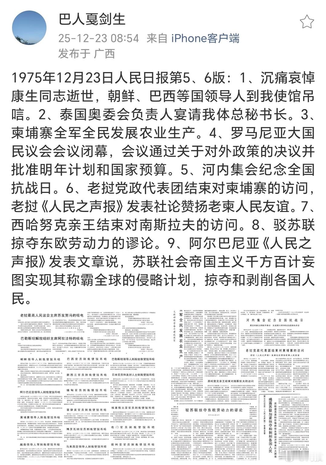 1975年12月23日的《人民日报》发表了以下内容?1版:今年又有二百万知识青年上山下乡,走与工农相结合的道路。2版:李先念副总理同达科斯塔总统继续会谈。 3版:人民送我上大学,我上大学为人民——清华大学应李小京、施桂花、钟友元、冯建立、金顺玉、傅青枝等一千八百多名应届毕业的工农兵学员几乎全部坚决要求到农村去,到青藏高原和祖国的边疆去。 4版:巩固和发展知识青年上山下乡的胜利成果,中共灵璧县委怀着满腔的热情和高度负责精神做好知识青年下乡工作。 5.6版:老挝最高人民协会主席苏发努冯、巴勒斯坦解放组织主席阿勒法特发来唁电沉痛哀悼康生同志逝世。 图6-9是当日部分内容图片。