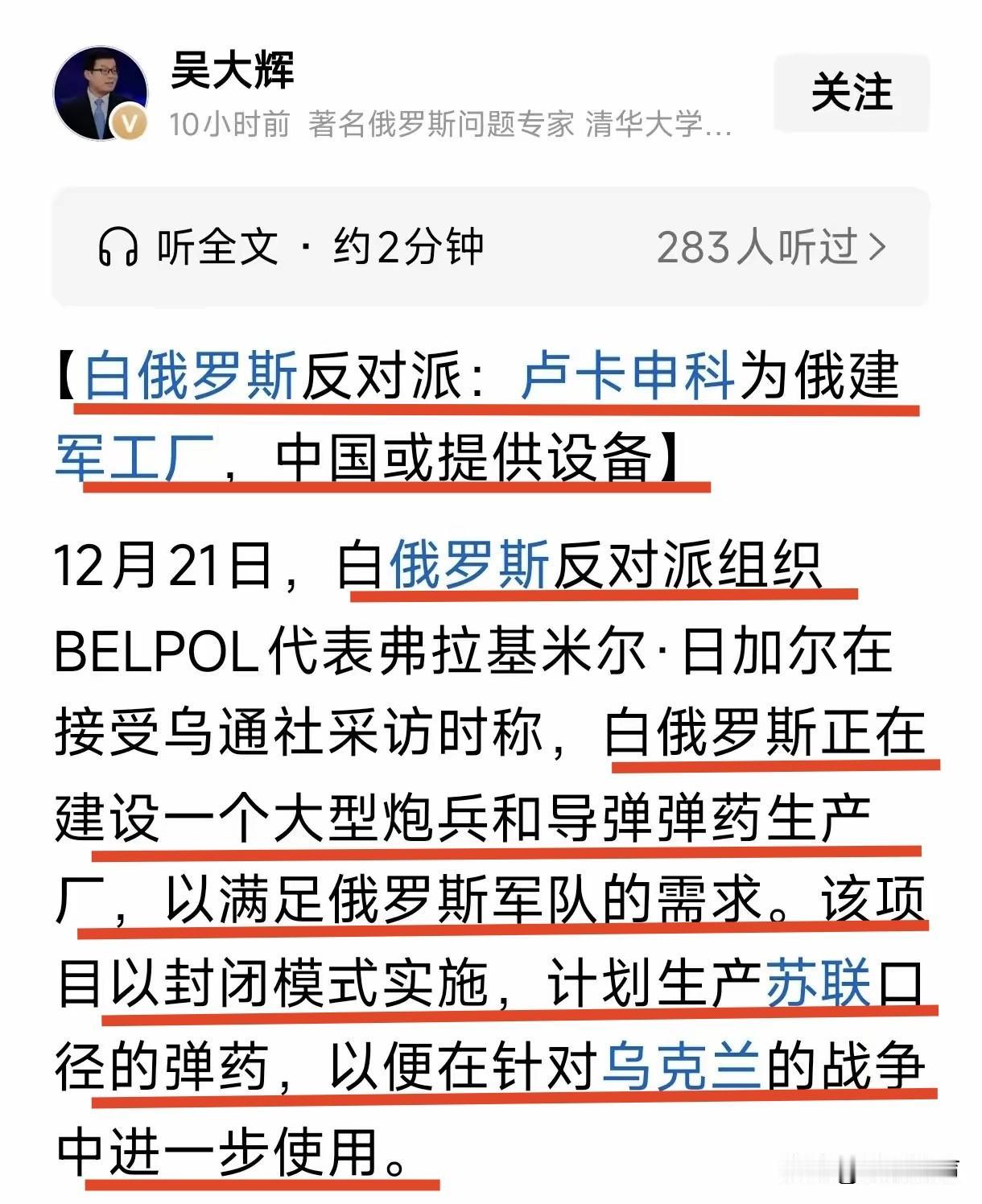 俄问题专家吴大辉:卢卡申科正在建一大型兵工厂,中国或提供设备,为俄生产导弹和炮弹,以满足俄军需求。 该项目采用封闭管理模式实施,计划生产苏联时期的各种口径弹药,以便于在针对乌克兰的战争中进一步使用。 苍狼读过这个简讯,有以下疑问: 1.经过中美欧三方力促,俄乌不是接近达成协议,快实现停战了吗?为何还要扩大弹药生产?难道还想继续打? 2.为何要生产苏联口径弹药?难道俄现在国内,不仅现代武器接济不上,连苏联时期武器都紧张,要予以补充? 3.对“中国或提供设备”有疑问!我们是世界负责任大国,又是安理会常任理事国,在俄乌战争问题上立场明确! 就是遵守“联合国宪章”与“国际法”,尊重任何国家领土完整与主权,反侵略反恐暴!怎会为这种工厂提供设备? 再看吴大辉短文,原是引自“白俄反对派”代表,接受乌媒采访时说的话!这就有水分了。可能是在制造谣言? 若是白俄反对派制造谣言,目的无非两个:一是栽赃卢卡申科,激怒乌欧美对其实施制裁,鹬蚌相争渔翁得利? 二是栽赃中国,破坏中国和乌欧美的良好合作关系,以及中国改革开放,持续发展良好局面。我们一定要警惕! …………
