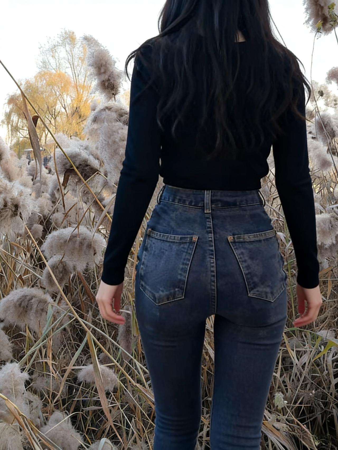 荻花如雪覆汀洲,佳人背立思悠悠。 黑衣曳影凝寒碧,牛仔裁云映素秋。 长发垂波沾晓露,纤腰束素惹轻鸥。 郊原一望无穷意,都入芦花梦里头。