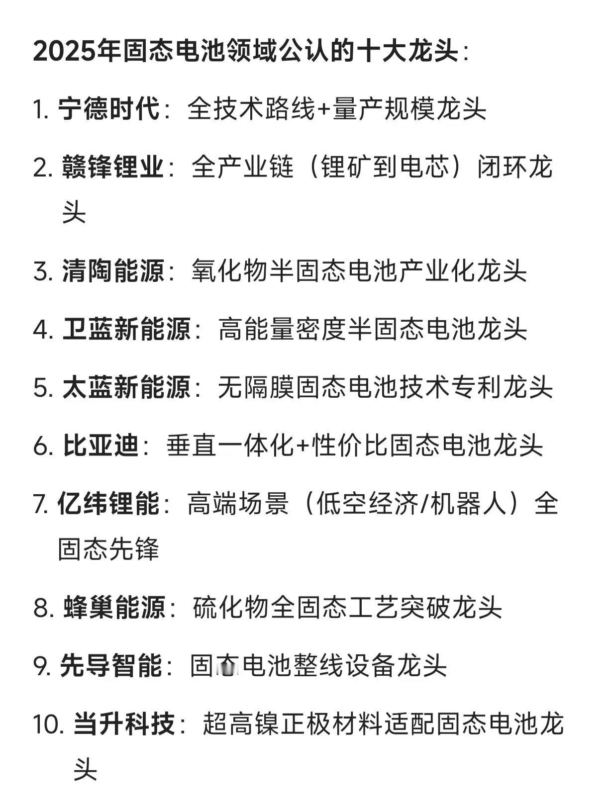 2025年固态电池领域公认的十大龙头宁德时代:全技术路线+量产规模龙头赣锋锂业:全产业链(锂矿到电芯)闭环龙头清陶能源:氧化物半固态电池产业化龙头卫蓝新能源:高能量密度半固态电池龙头太蓝新能源:无隔膜固态电池技术专利龙头比亚迪:垂直一体化+性价比固态电池龙头亿纬锂能:高端场景(低空经济/机器人)全固态先锋蜂巢能源:硫化物全固态工艺突破龙头先导智能:固态电池整线设备龙头当升科技:超高镍正极材料适配固态电池龙头