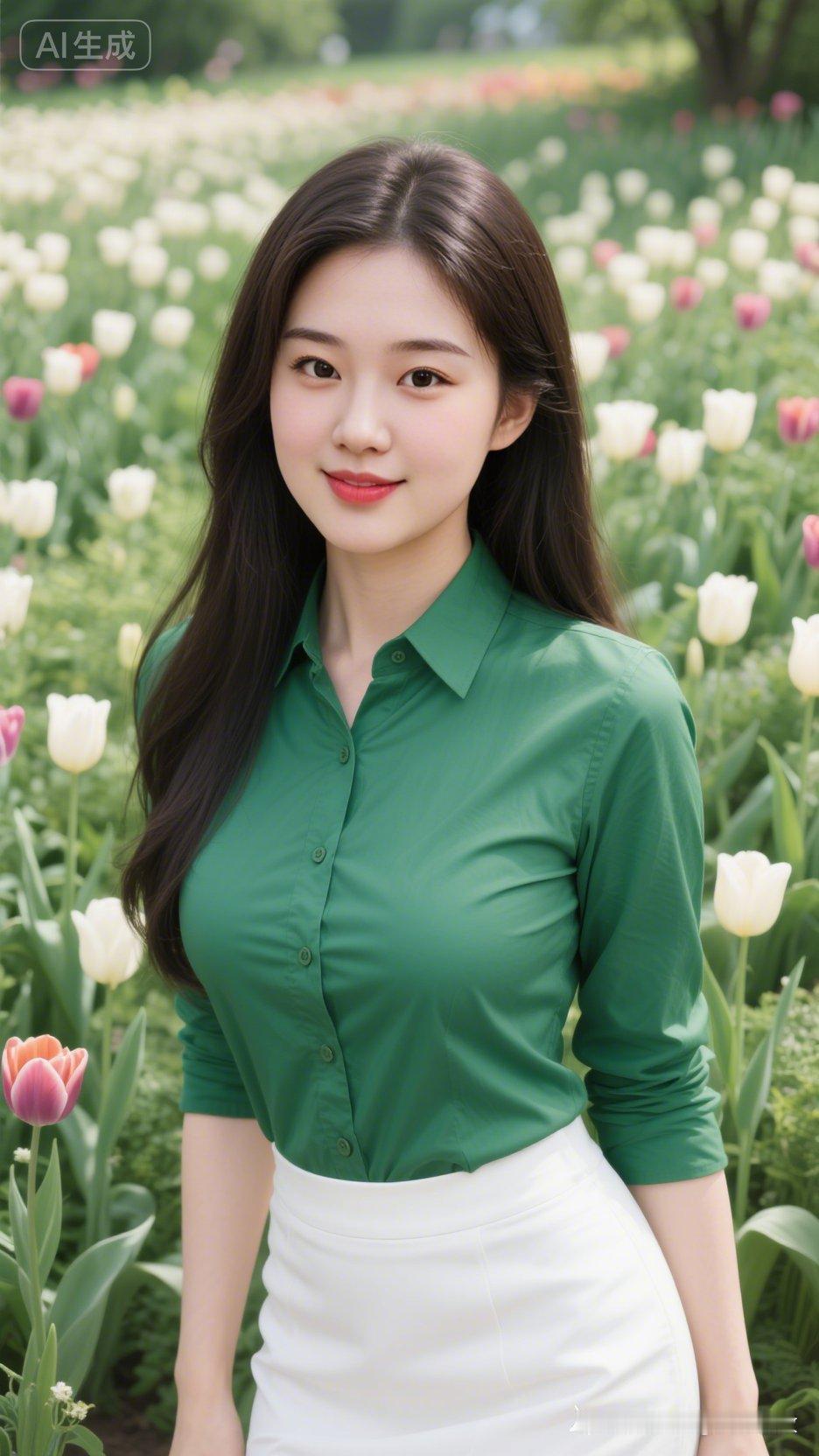 春日花海中的清新少女,绿色衬衫与白色裙摆的完美搭配,绽放自然之美!🌸💚👗