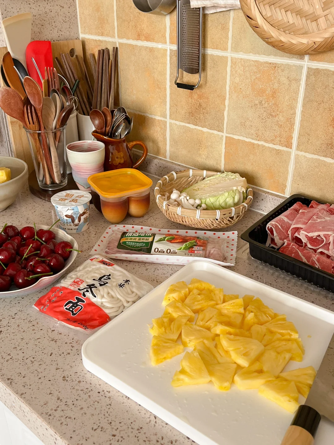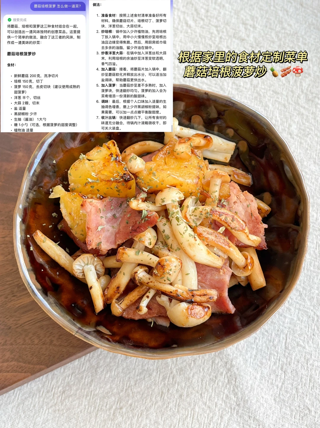 还用冰箱里的库存 培根、白玉菇、菠萝