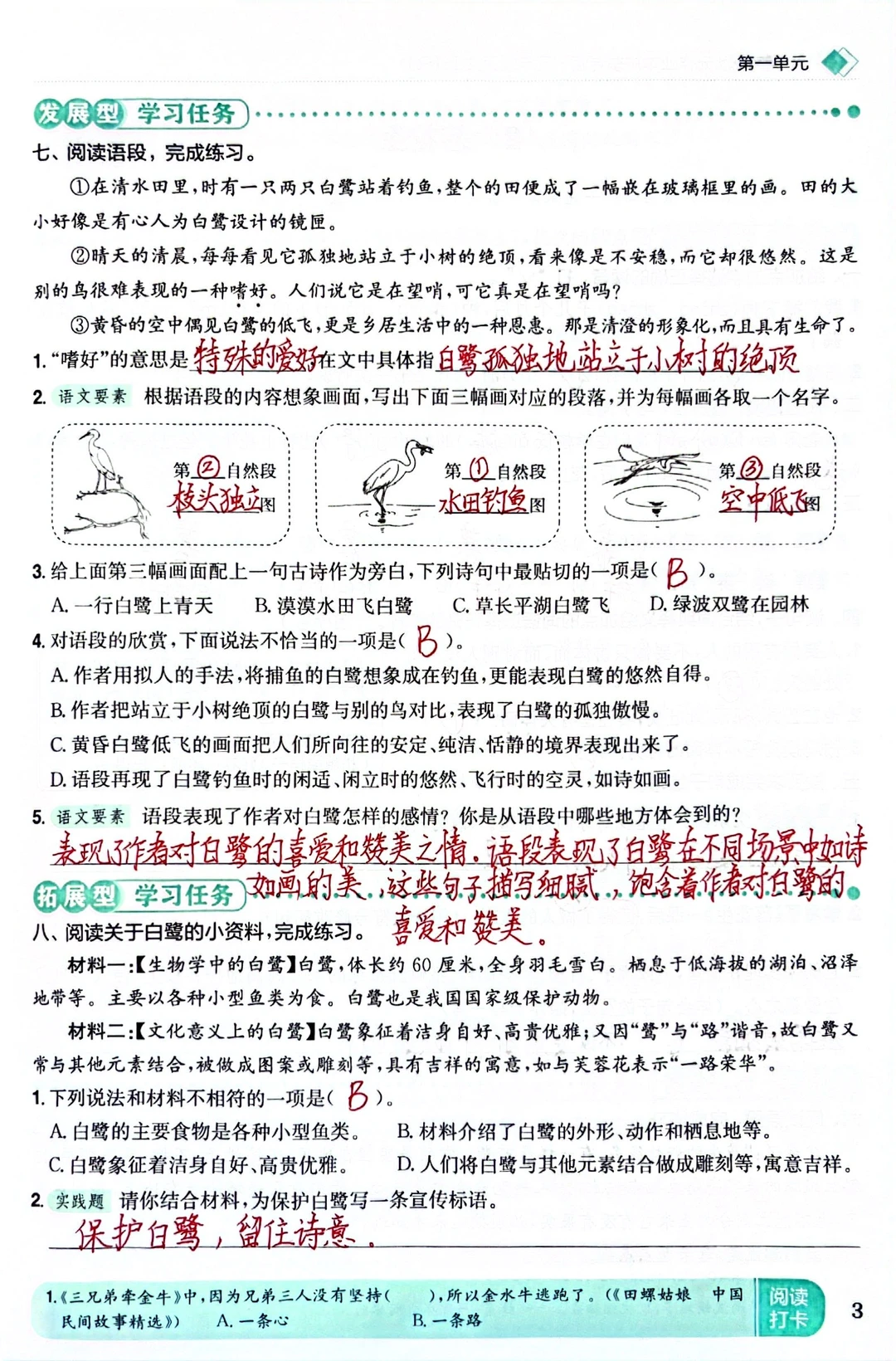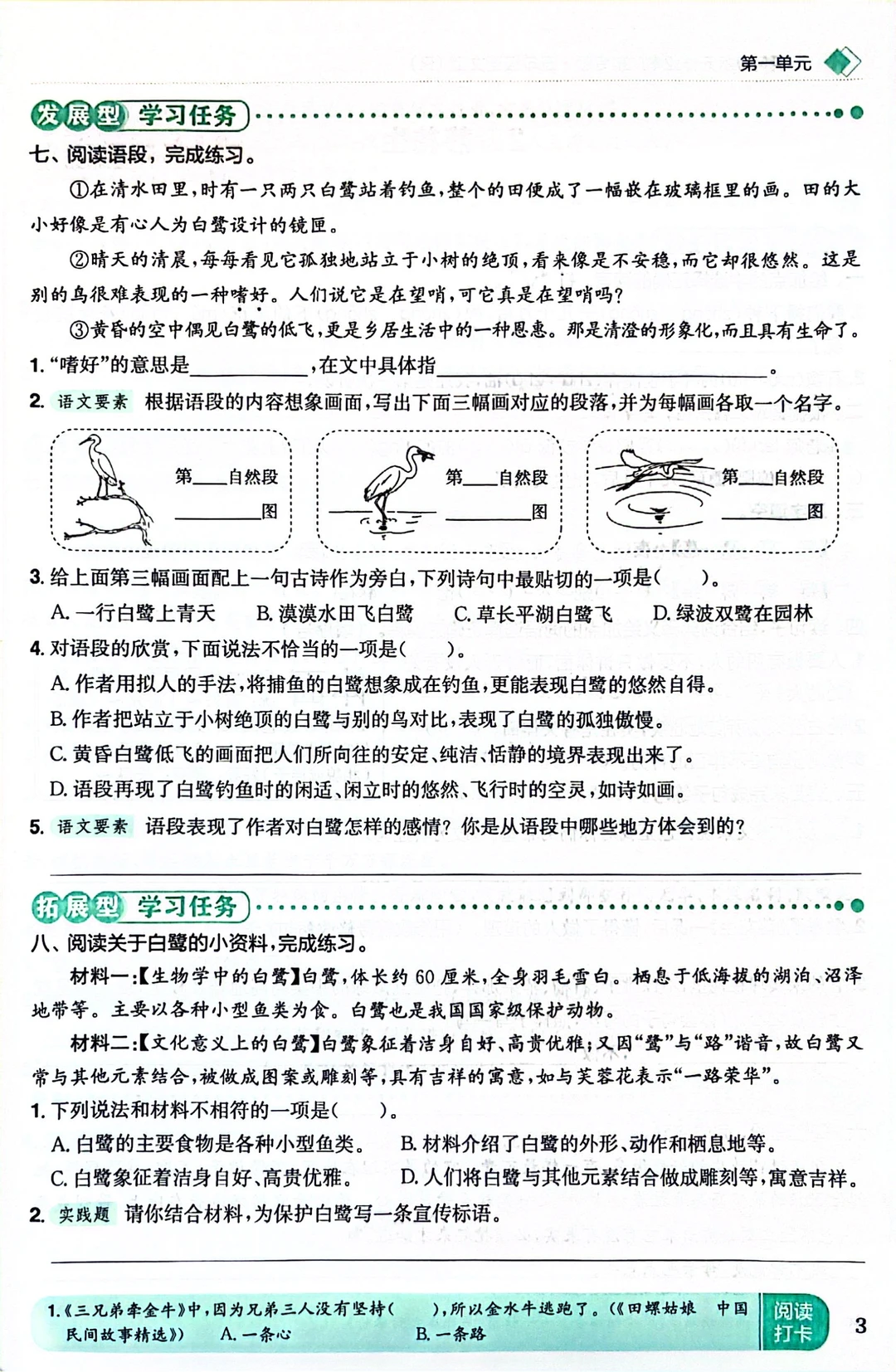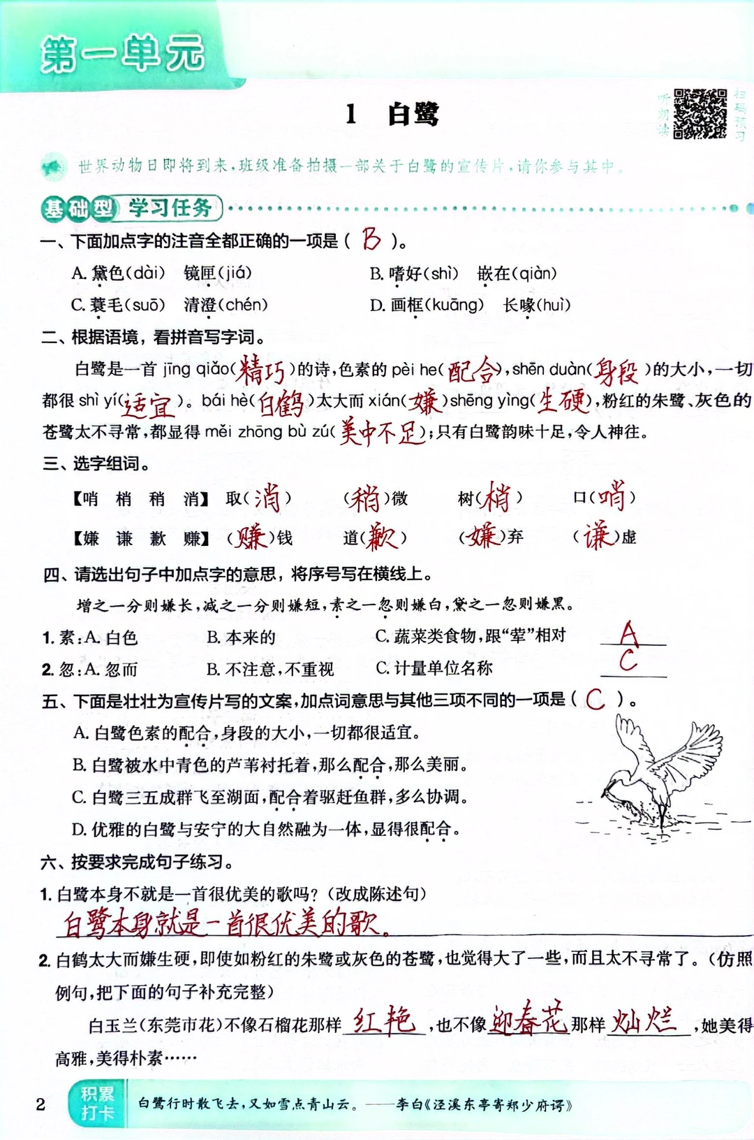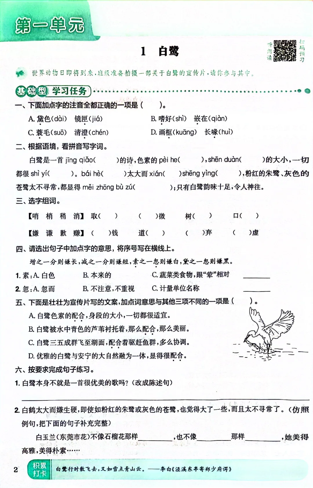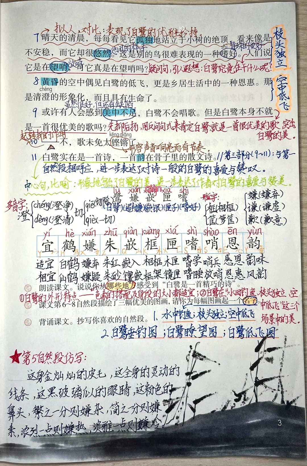 课堂笔记➕课后练习题 【学习目标】 1认识“鹭、嫌”等生字,会写“宜、鹤”等字,会写“精巧、配合”等词语。 2.能想象并说出作者所描写的画面。(重点) 3.能借助关键语句,体会作者对白鹭的赞美之情,了解作者是如何把这种感情融入对白鹭的描写中的。(难点) 4. 背诵课文,积累喜欢的段落。 【拓展积累】 1. 西塞山前白鹭飞,桃花流水鳜鱼肥。 ——唐•张志和《渔歌子》 2. 两个黄鹂鸣翠柳,一行白鹭上青天。 ——唐 • 杜甫《绝句》