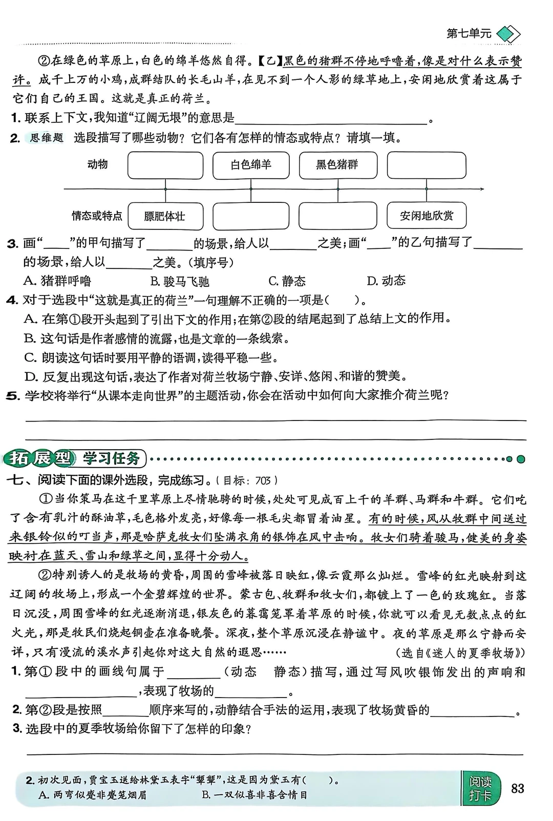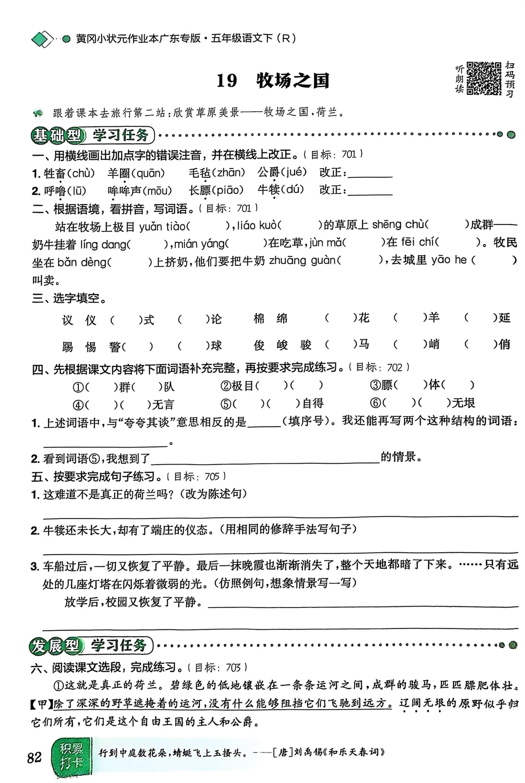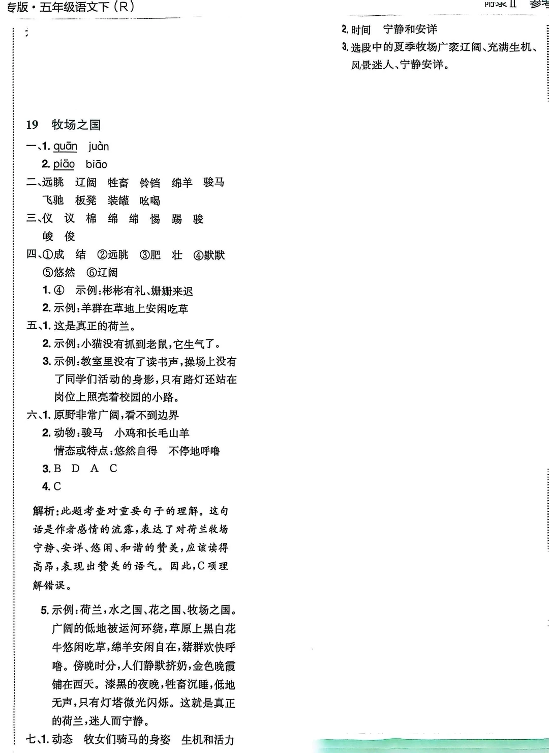 五下语文第19课《牧场之国》课堂笔记及习题