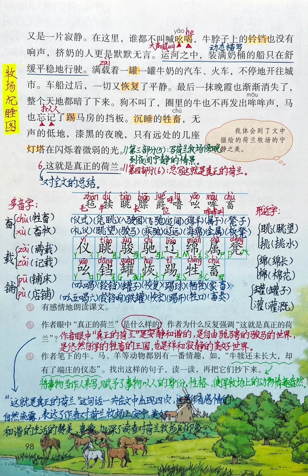 【带着问题读课文】 ①荷兰牧场的白天、傍晚、夜晚分别是什么样的?②作者描写了荷兰牧场的哪几幅画面? 【学习目标】 1.认识“毡、犊”等生字,会写“仪、眺”等字,会写“端庄、仪态”等词语。 2. 有感情地朗读课文,摘抄积累文中描写牛、马、羊等动物的语句,并体会其中的情趣。(重点) 3.能通过文中的静态描写体会荷兰牧场的宁静之美,并能感受课文反复强调“这就是真正的荷兰”的表达效果。(难点) 【资料助学】 荷兰:荷兰位于欧洲大陆西北部,地势非常平坦,是世界上有名的低地之国,而且境内河流众多,航运发达,牧场众多,花卉种植广泛,有“低洼之国”“风车之国”“运河之国”“牧场之国”“花之国”“水之国”等别称。