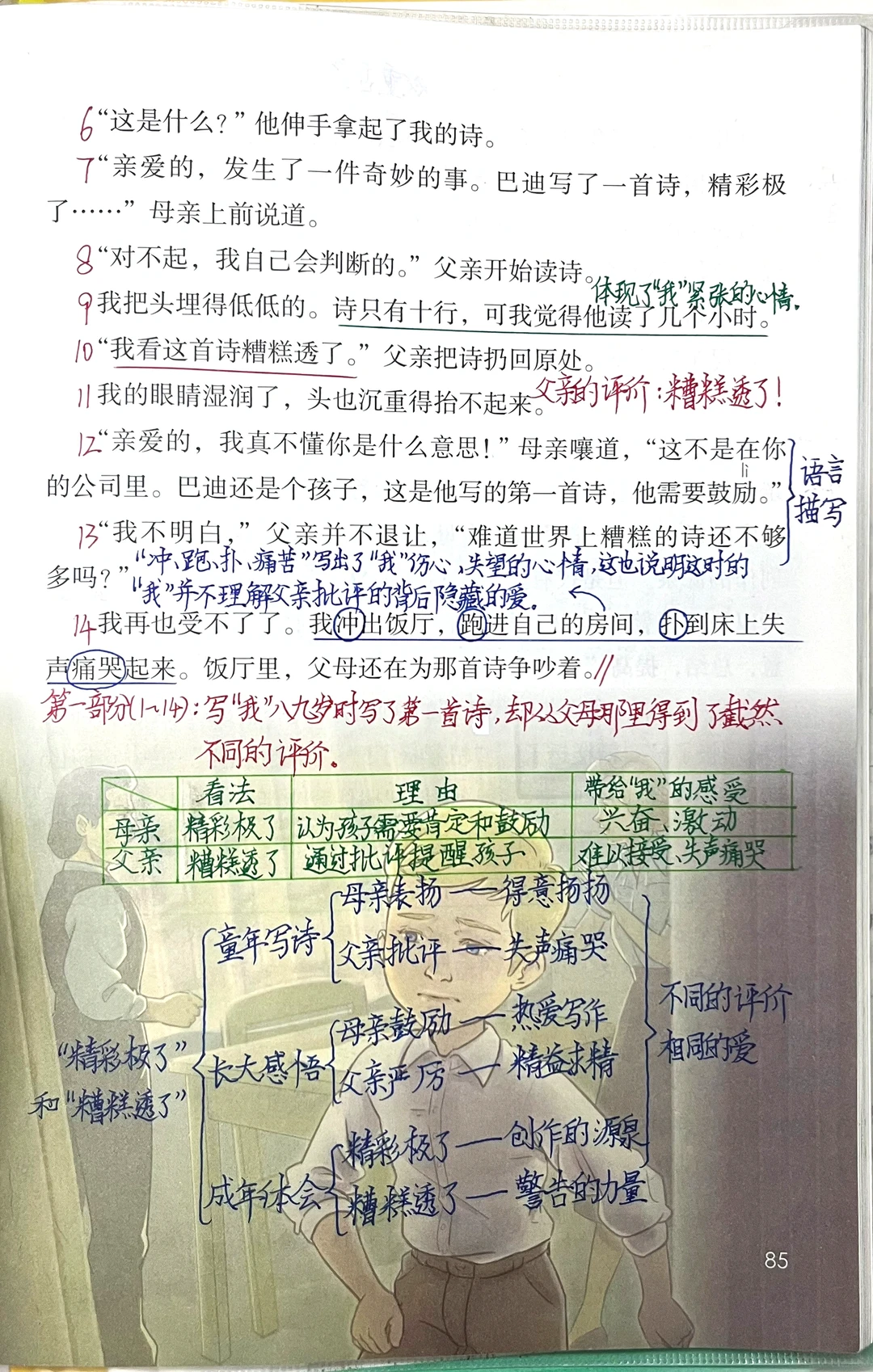 2.默读课文,了解父母对同一首诗不同评价的原因。(重点)