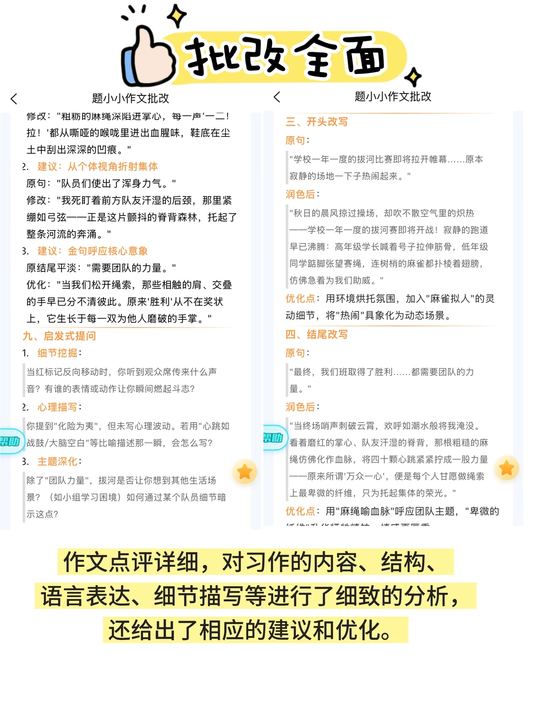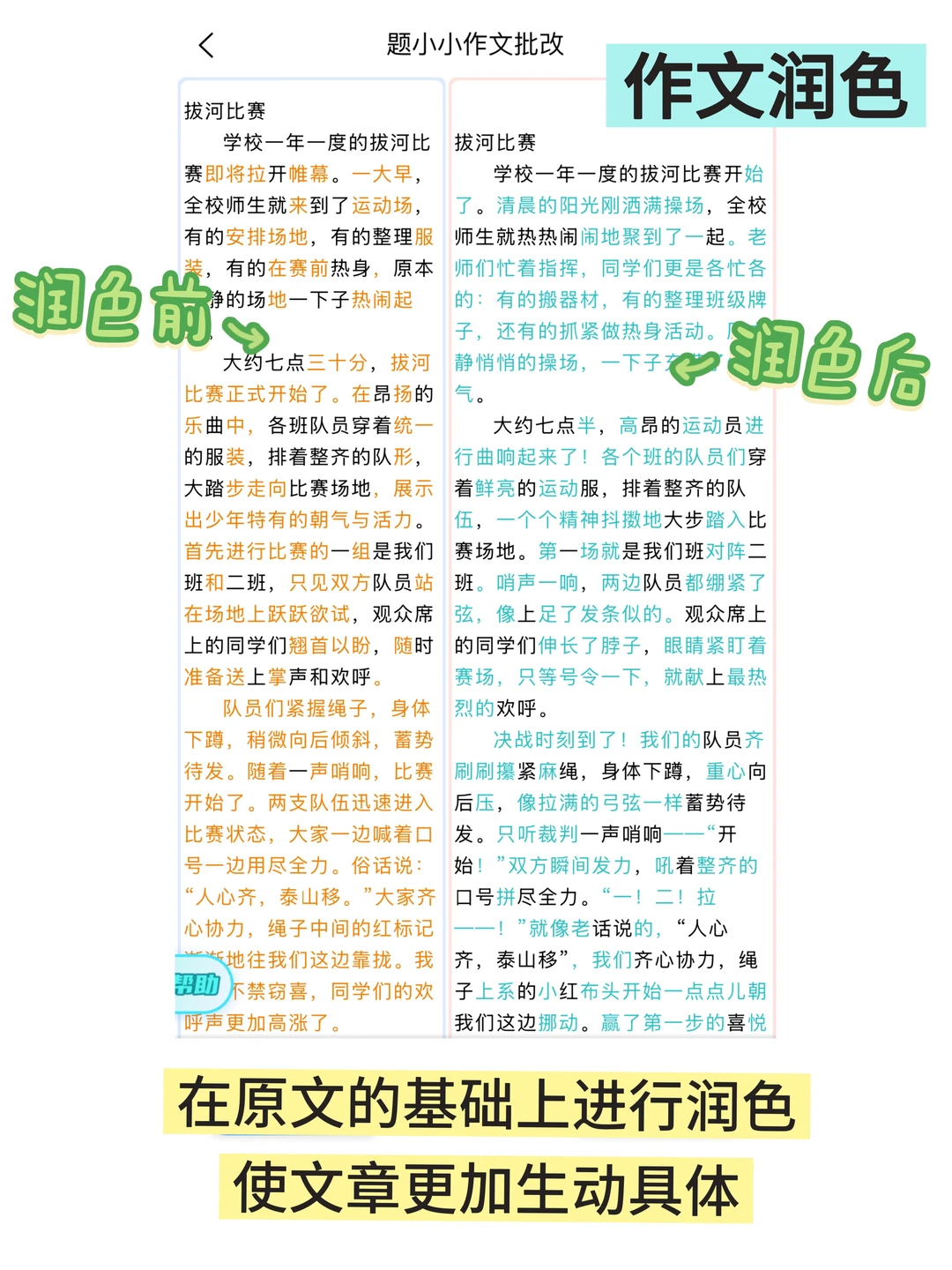 🌈它的批改比老师还“细”:不光揪错字、病句,连“太阳下山了”这种平淡句,都会提示可以加颜色或者动态,孩子一看就知道怎么改;