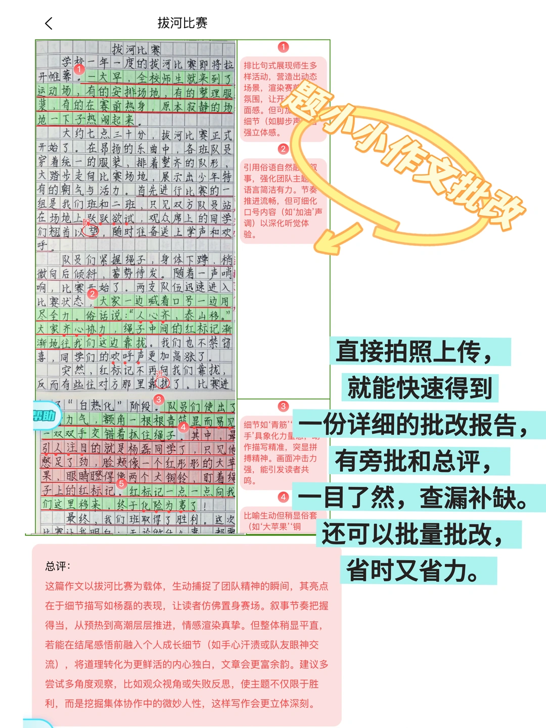 👩🏫教语文这么多年,我渐渐发现改作文不是“挑错”,而是帮孩子找到“能进步的点”。但面对班里40个多孩子,我一个人的精力是非常有限的,好在有题小小作文批改工具,批量批改40多本作文,能快速帮我解决难题,改作文效率提高了不少。它不仅是语文老师的好帮手,更是孩子写作的进步源泉。