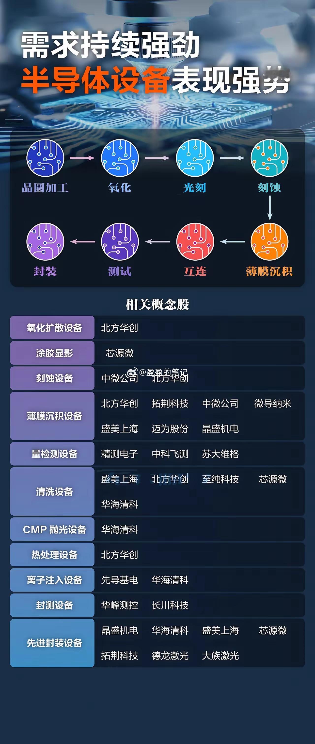 今天半导体设备板块大涨。AI发展推动算力需求持续增长,带动半导体设备板块强势走高。核心算力载体GPU领域,据Yole测算,2024-2029年全球IDC GPU市场规模将从856亿美元增至1620亿美元,CAGR达13.6%;半导体设备方面,SEMI数据显示,2025年全球OEM半导体制造设备销售额预计1330亿美元(+13.7%),2026-2027年将续增至1450亿、1560亿美元,增长核心源于AI相关投资,聚焦尖端逻辑电路、存储器及先进封装技术应用。AI算力竞赛是行业增长的核心引擎,GPU作为算力核心载体需求爆发,直接拉动上游半导体设备投资;同时,半导体技术向先进制程、3D堆叠等方向升级,推高刻蚀、薄膜沉积、先进封装等设备的价值量与需求。当前行业已进入高景气周期,2025-2027年销售额持续创新高,印证AI驱动下的成长韧性,国产替代与技术突破叠加,龙头企业将充分受益。相关上市公司1. 半导体设备龙头:北方华创(平台型设备巨头,覆盖刻蚀、薄膜沉积等全产业链)、中微公司(刻蚀设备龙头,攻克3D NAND核心技术);2. GPU/算力芯片:景嘉微(A股纯正GPU龙头,军民用场景落地)、海光信息(DCU产品对标GPGPU,适配AI计算);3. 先进封装:长电科技(CoWoS封装量产,AI芯片订单激增)、通富微电(绑定AMD,算力封装业务高增);4. 存储器:兆易创新(SPI NOR Flash全球市占率第二,受益存储需求回暖)。